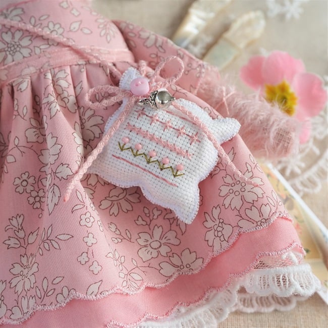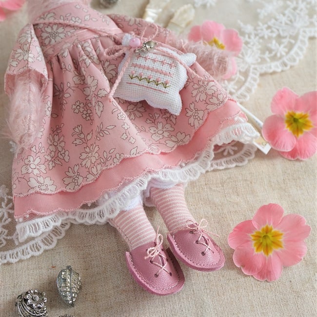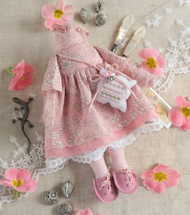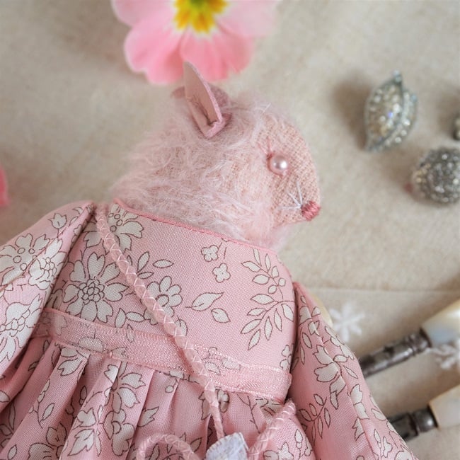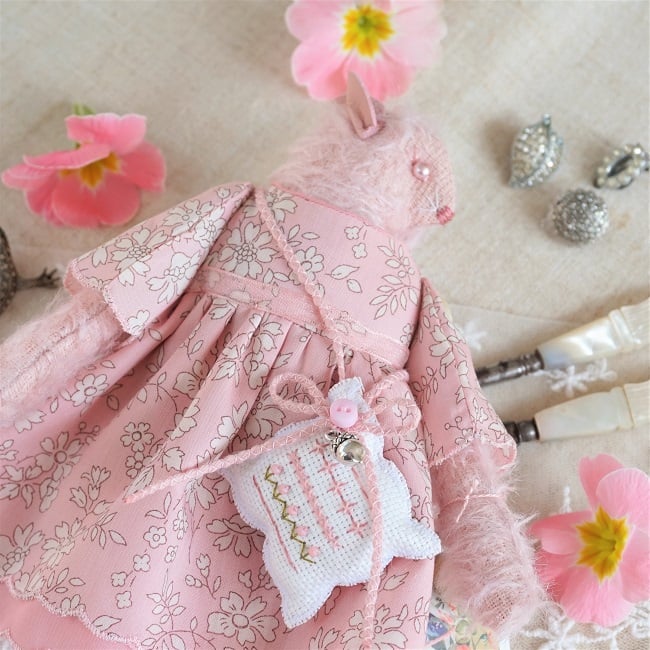 This is a little pink mohair mouse made from Steif German Sparse Pink Mohair. Her face is hand embroidered with pink beads for her eyes. She is dressed in a pretty Liberty print fabric called Capel Pink with matching underskirts in cotton and lace. She has little pink leather ears and a tiny pink leather tail peeping our from her cotton broderie anglais drawers. She is firmly stuffed with rose petals to her stuffing for a gentle scent and with a rose quartz crystal to her heart.