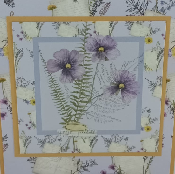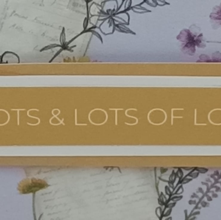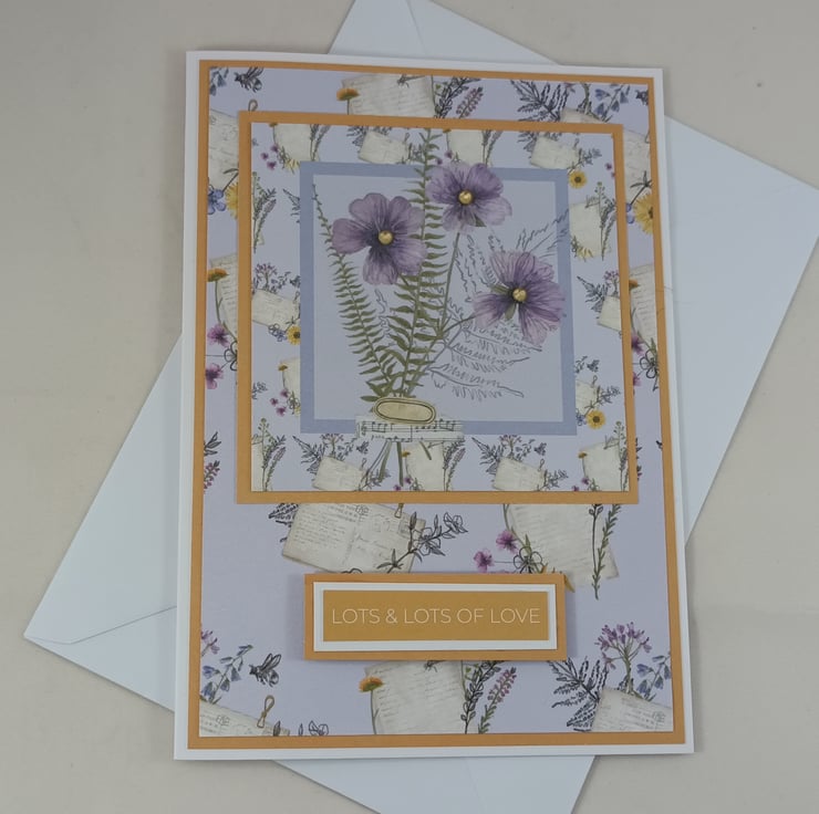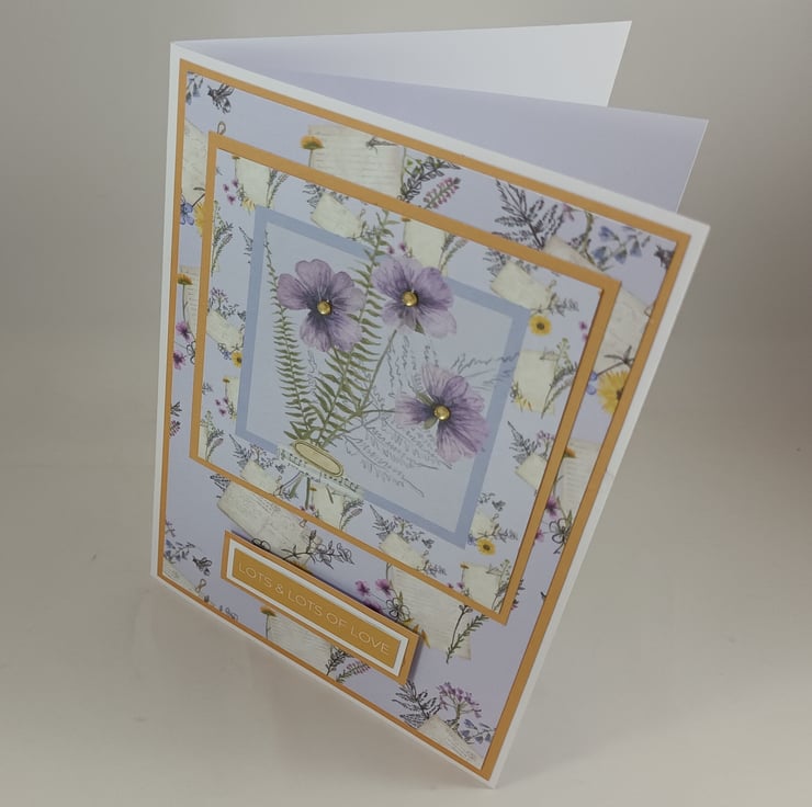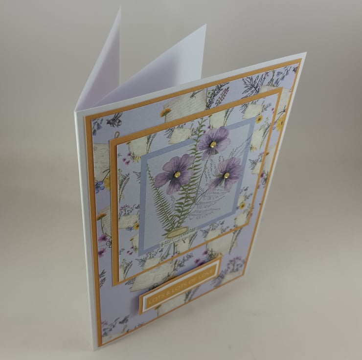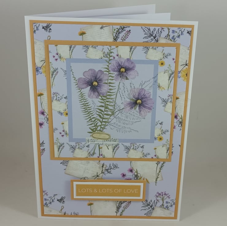 A6 greetings card suitable for birthdays, get well soon, thank you or thinking of you. The card features a topper with blue flowers and foliage, mounted onto mustard yellow card, over a matching floral background. The sentiment, also mounted onto mustard card reads 'Lots & Lots of Love'. The flowers are embellished with small adhesive gems in the centres. The insert has been left blank for your own message, depending on the occasion.