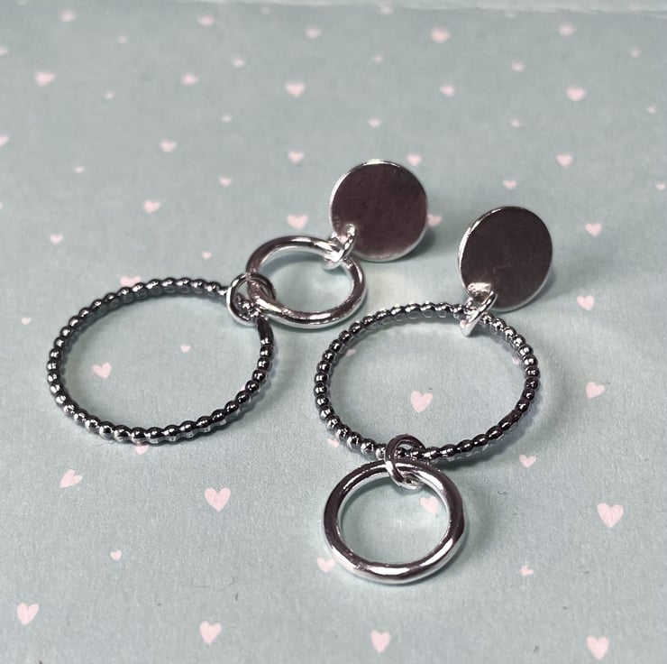 Unusual sterling silver asymmetric dangle earrings. Featuring stud backed plain silver circles and one plain and one dotty silver loops. Striking earrings which are comfortable enough to take you from day to evening.