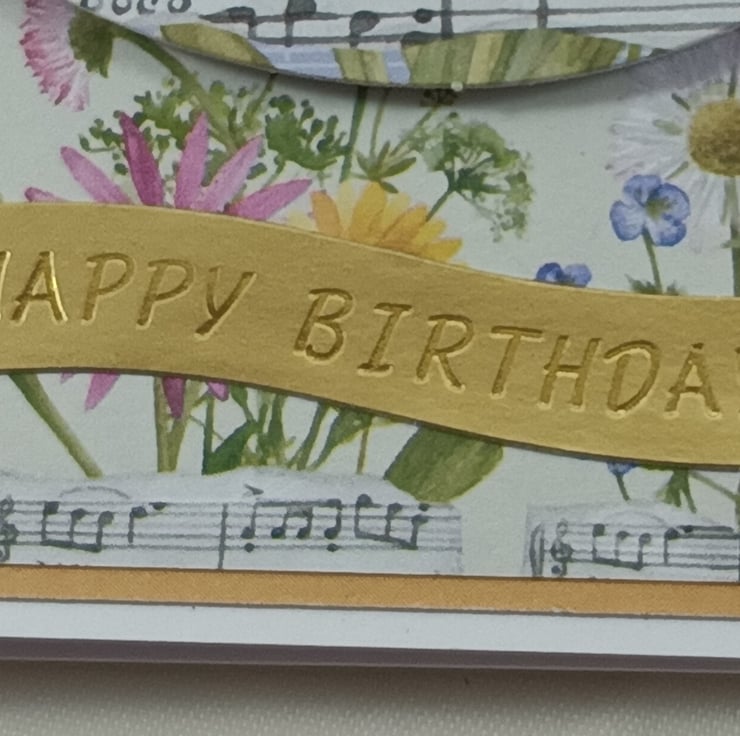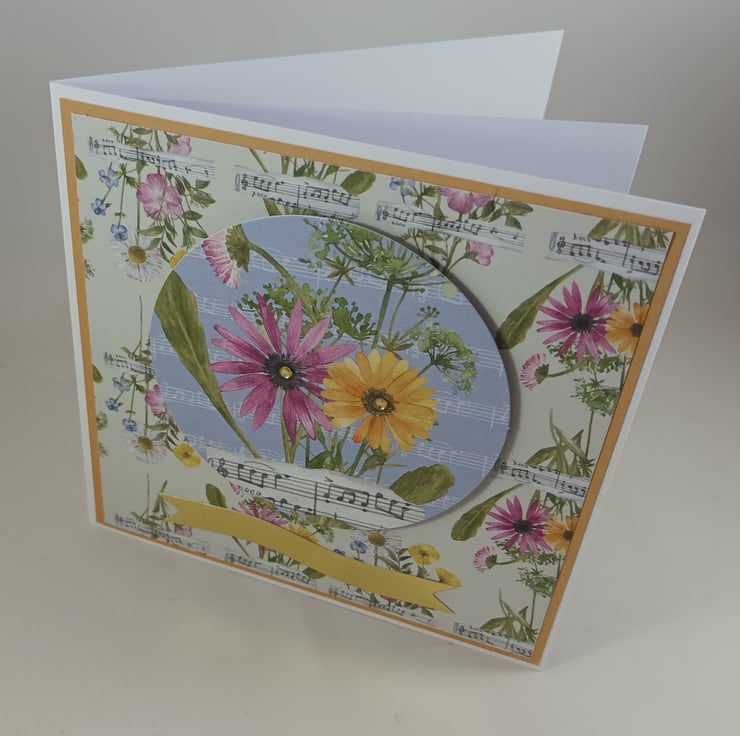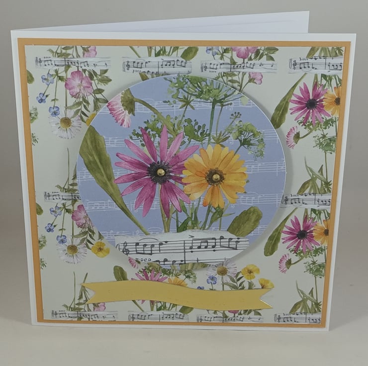 Square floral birthday card. The card has a circular flower themed topper overlaid onto a matching background paper. The flowers have had adhesive gems added to the centres. The foil banner sentiment reads: 'Happy Birthday'. The insert has been left blank for your own message.