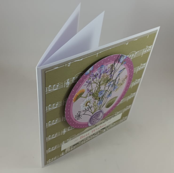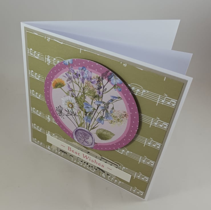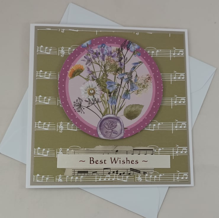 Square, floral any occasion card. The card has a circular topper with a bouquet of wild flowers overlaid onto a musical background paper, framed with coordinating card. The foiled sentiment reads ' Best Wishes' and has been overlaid onto vintage music paper. The insert has been left blank for your own message, depending on the occasion.