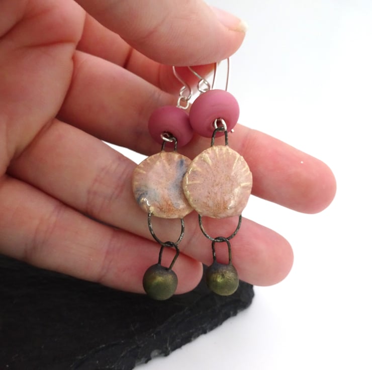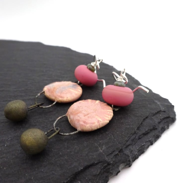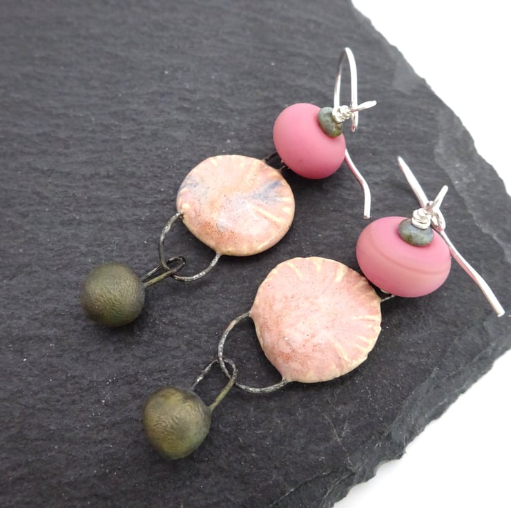 A pair of earrings made with handmade sterling silver ear wires, handmade lampwork glass beads and handmade ceramic drops with a pink glaze and bronze ceramic drops.