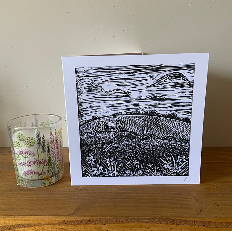 The Rabbit linocut design on this card is entitled Spring time near Thixendale’, which is a little country village in the Yorkshire wolds, not far from my home. The countryside around Thixendale and throughout the Yorkshire wolds is made up of steep dales and undulating hills. It re awakens in spring when the daffodils come up giving refreshing colour to the landscape in their little roadside clumps and Rabbits and other wildlife can be seen frolicking in the fields as if they’re also excited to see that spring has arrived.