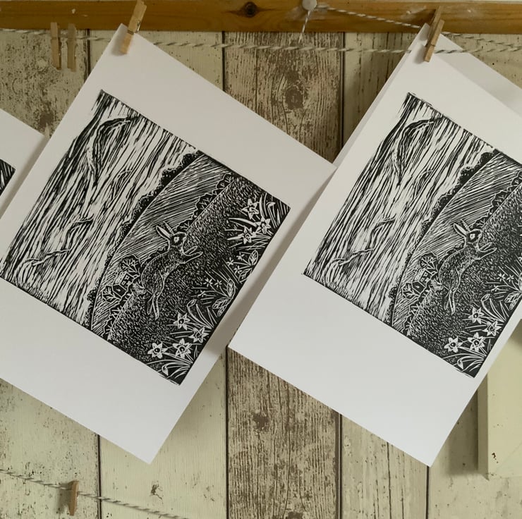 An original lino print card showing a leaping Rabbit in spring. Hand printed in my home studio in Yorkshire, using eco friendly oil based black ink on quality 300gsm white card.