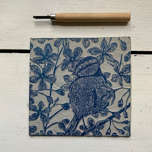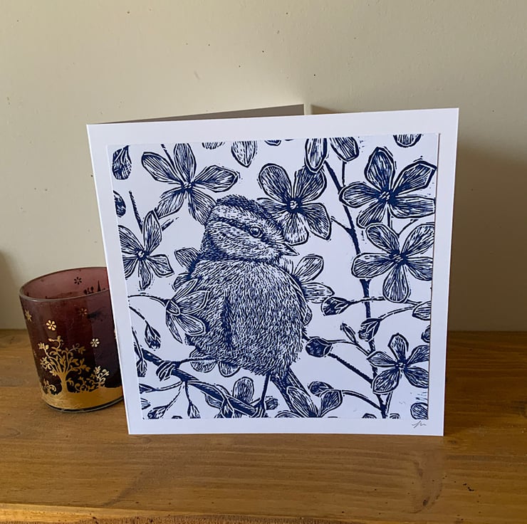 An original lino print card depicting a sweet little Blue Tit in Spring blossom.