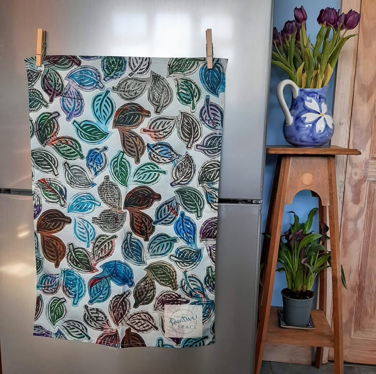 The tea towel features part of my original paper collage design, with my logo. See the original image in my photos, and the tea towel sitting with it, as well as in situ, and on the washing line!