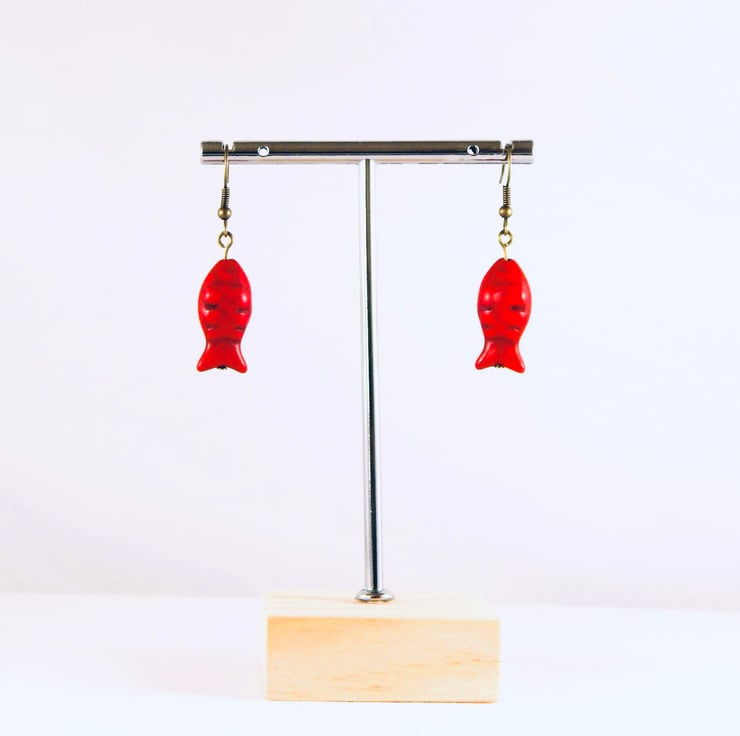 Fun earrings made using red howlite fish shape beads with bronze earring hooks