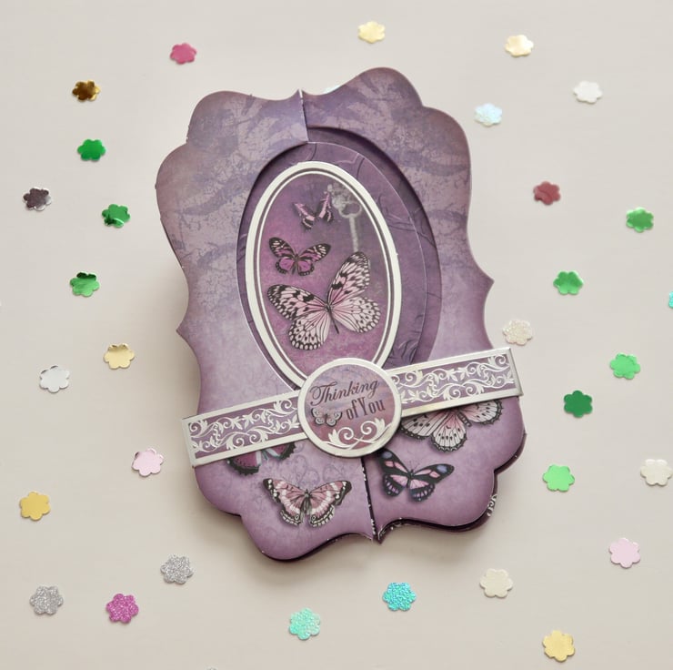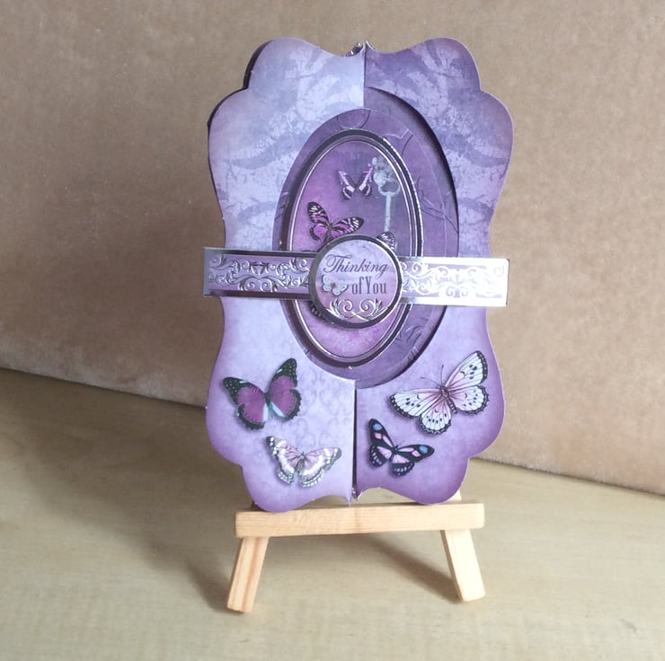 A silver and purple patterned 'belt', with the words "Thinking of You", keeps the card flat when folded.
