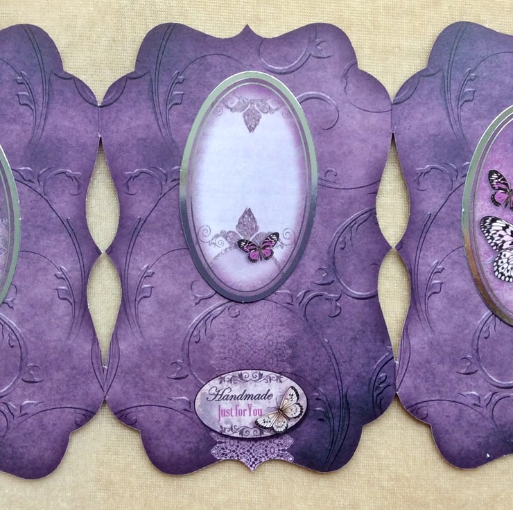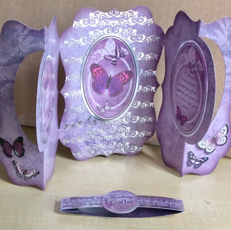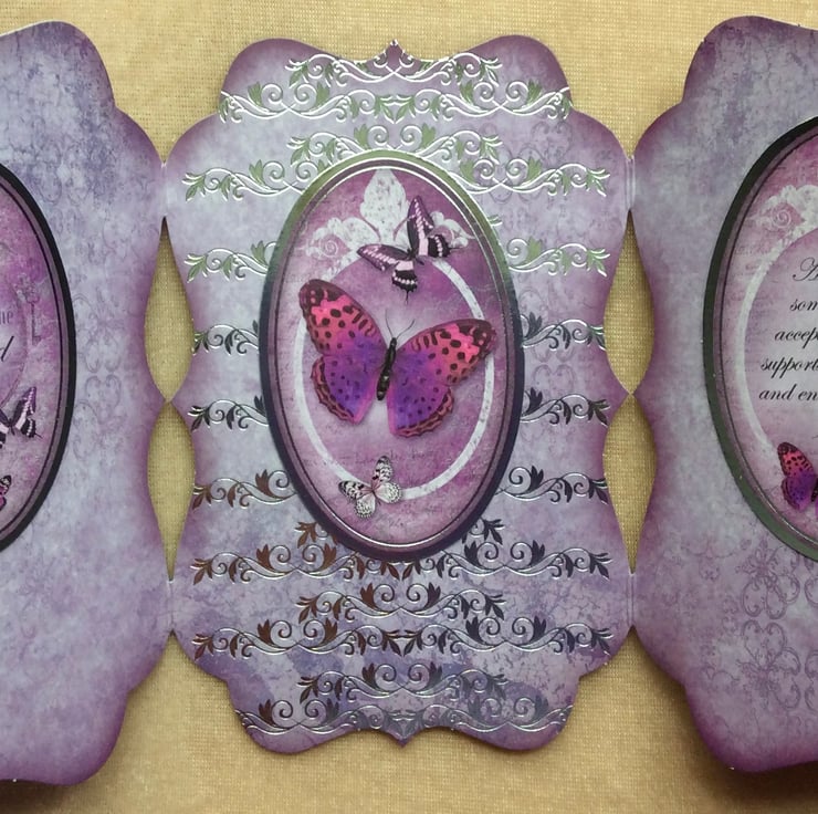 The purple printed card has a butterfly theme that runs throughout and opens outwards to reveal three sections. On the left side the greeting reads "You mean the World to me", the middle has butterflies on a metallic silver patterned background and the right hand side has the message "A friend is someone who accepts your past, supports your present and encourages your future".
