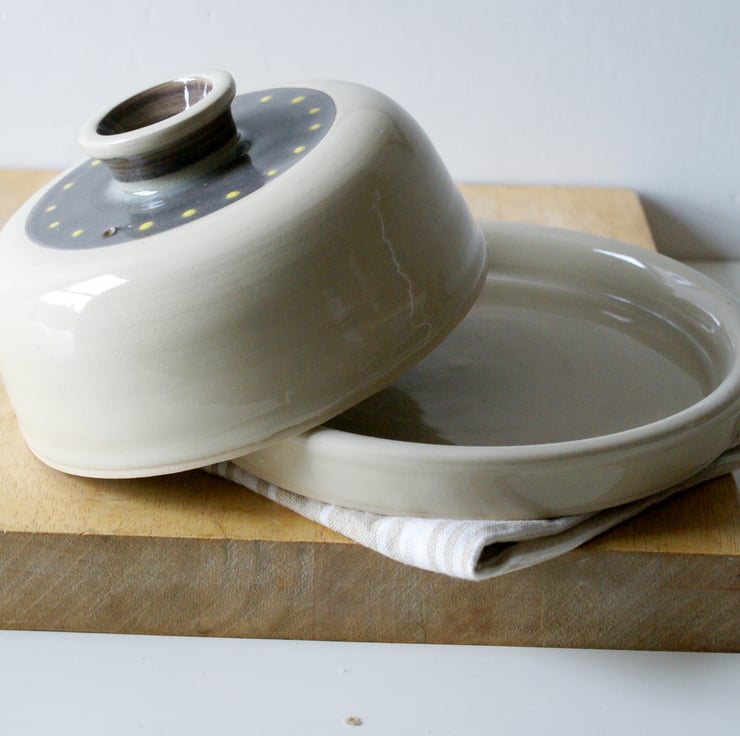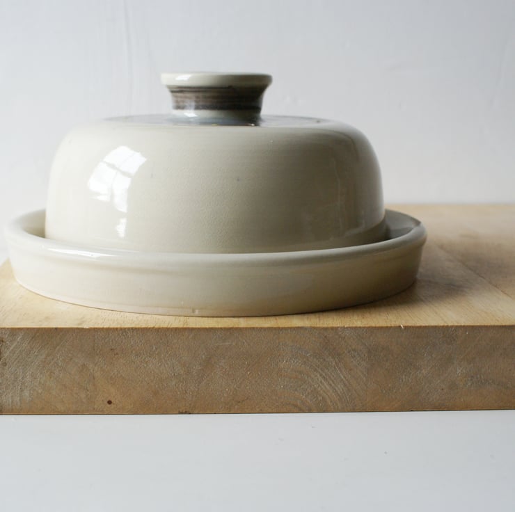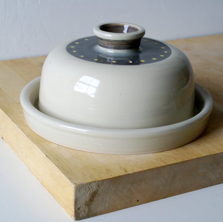 Hand thrown on my potters wheel this butter dish features a ledged plate, round dome and a slip design across the surface of the lid. It has been glazed simply in a transparent glaze for a glossy finish and to allow the slip to show through underneath.