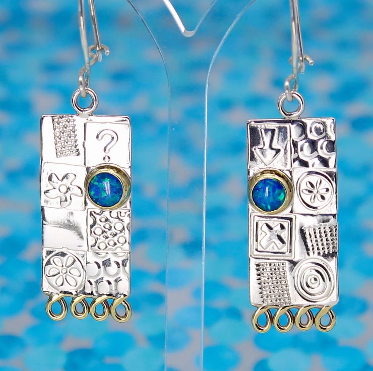 These contemporary earrings have been designed and handmade by us, in our workshop in Yorkshire. They are made from sterling silver with brass decorations and feature two gemstones. Symbols have been deeply embossed into the silver to create an interesting surface pattern. They measure 13mm x 28mm and have a total drop length of 38mm, including the sterling silver ear wires. These unusual earrings are similar to ones in our Asymmetrical jewellery range but have matching stones and decorations.