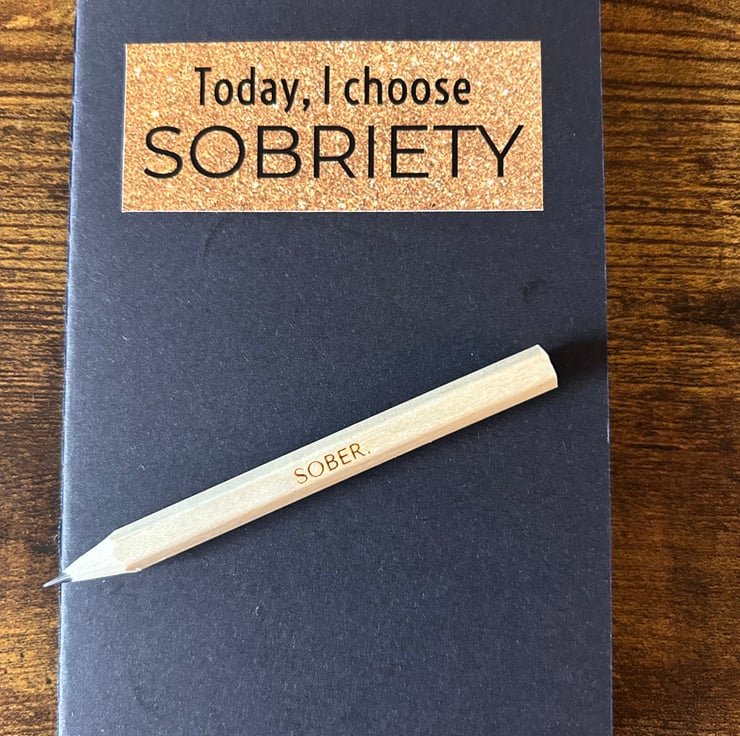 -‘sober’ engraved pencil with A6 pocket size black notepad, filled with lined paper and has a “I choose sobriety sticker” I have designed on the front.