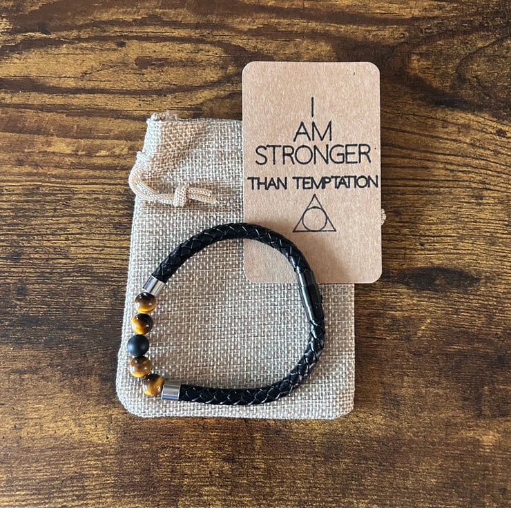 -Men’s Recovery Bracelet. Faux leather band and tiger eye beads comes with “I am stronger than temptation” backing I have designed in a wicker pouch.