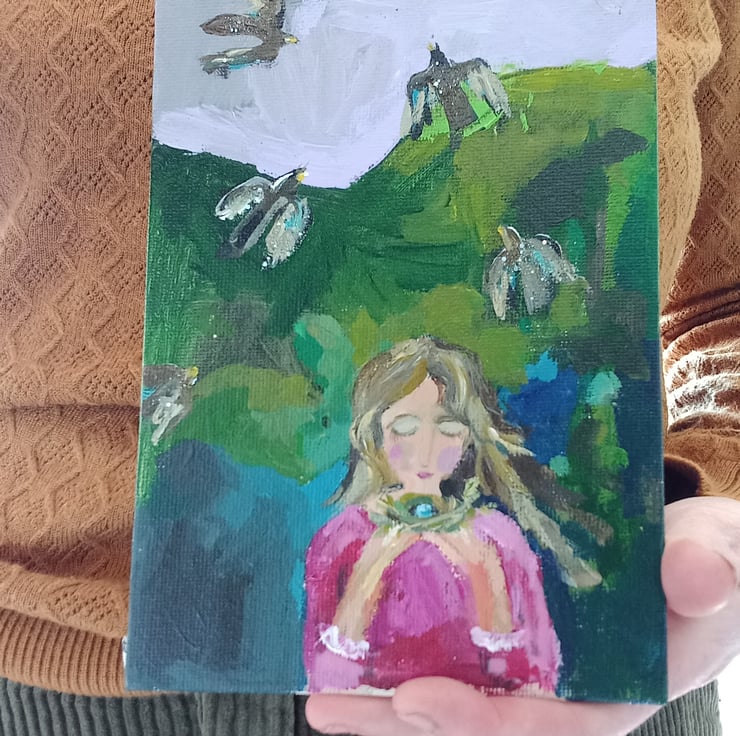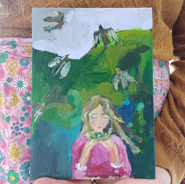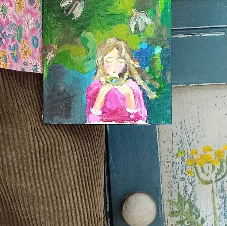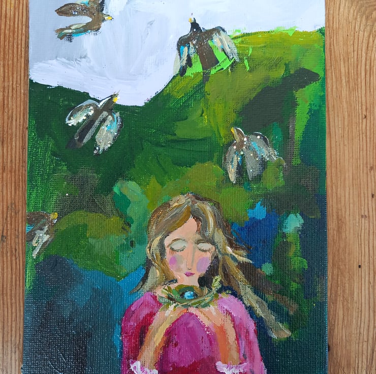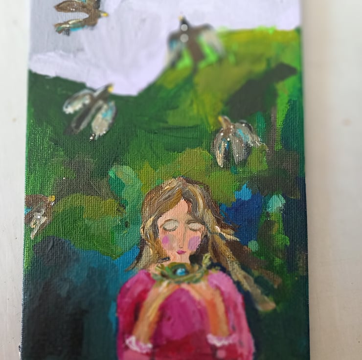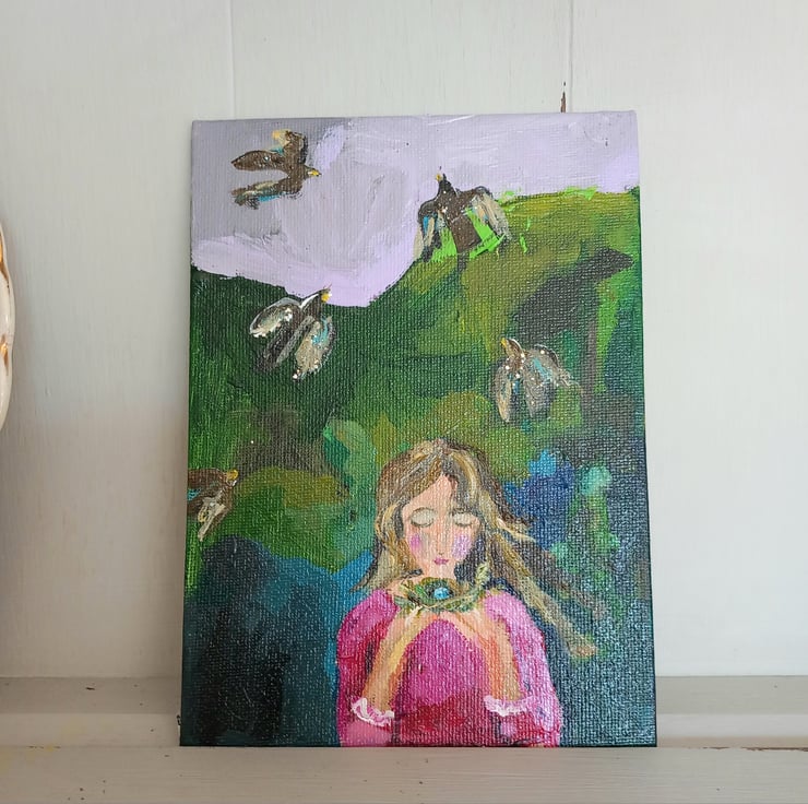 This is a small magical painting in my signature style. Painted on thin canvas board. A Lavender sky is the back drop.for the birds. A little hint of sparkle on the birds. The pink and green is my favourite colour combo . Measuring apox 18 cm tall