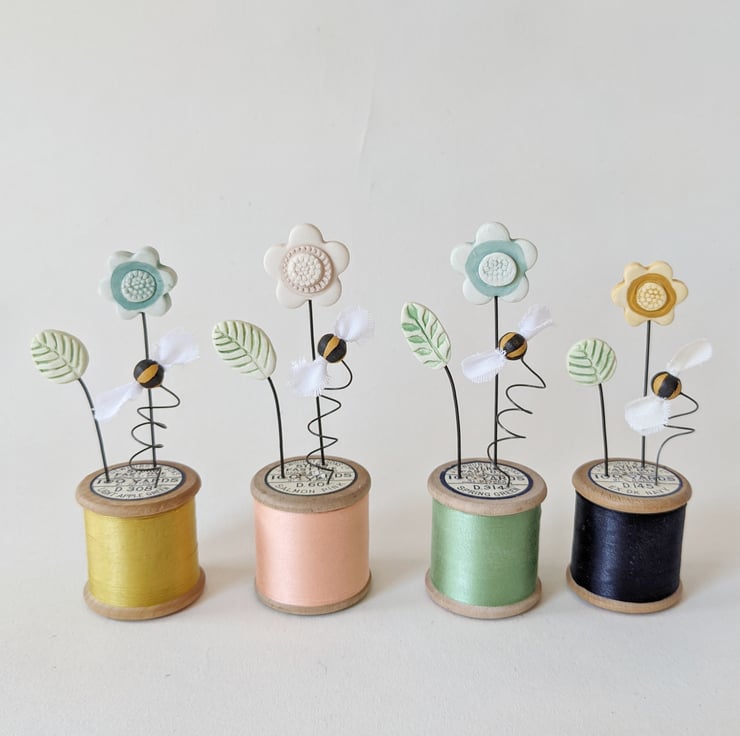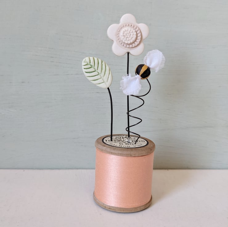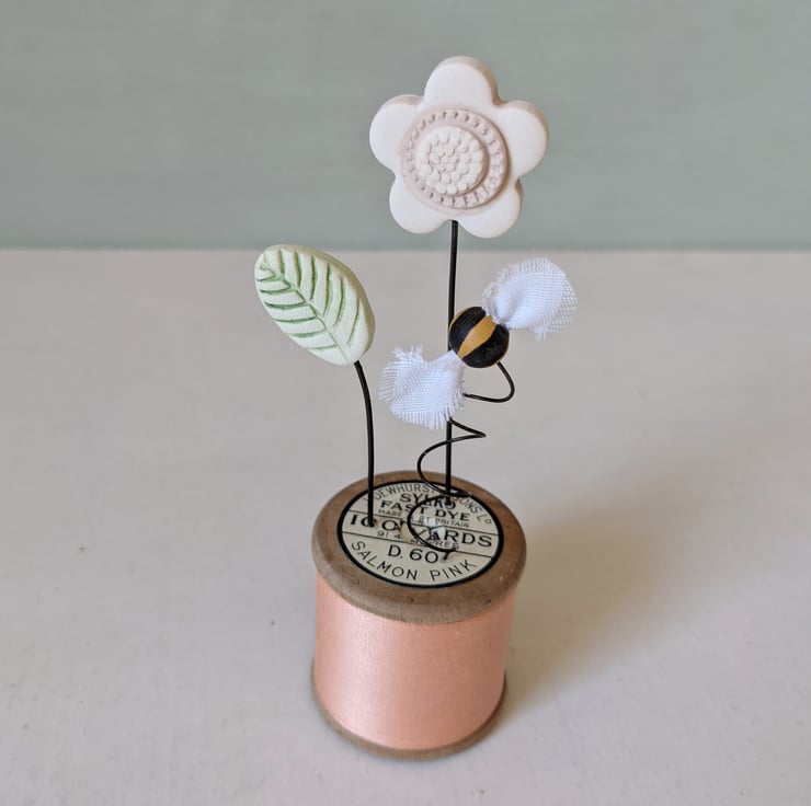A handmade little bee buzzes by a pretty flower in a vintage wooden bobbin.