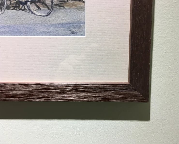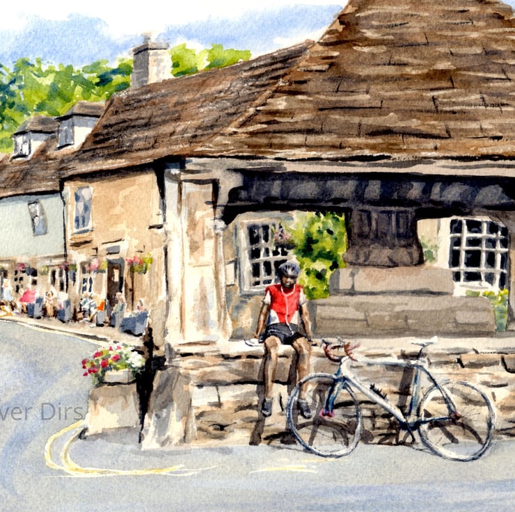 An original watercolour painting of a cyclist resting in the picturesque village of Castle Combe in Wiltshire, England, signed by the artist. Presented in an attractive wooden frame with a white mount. Framed dimensions: 38x34cm. Image dimensions: 24x19cm.