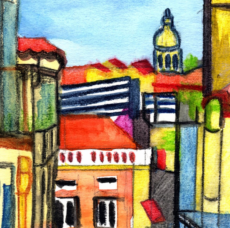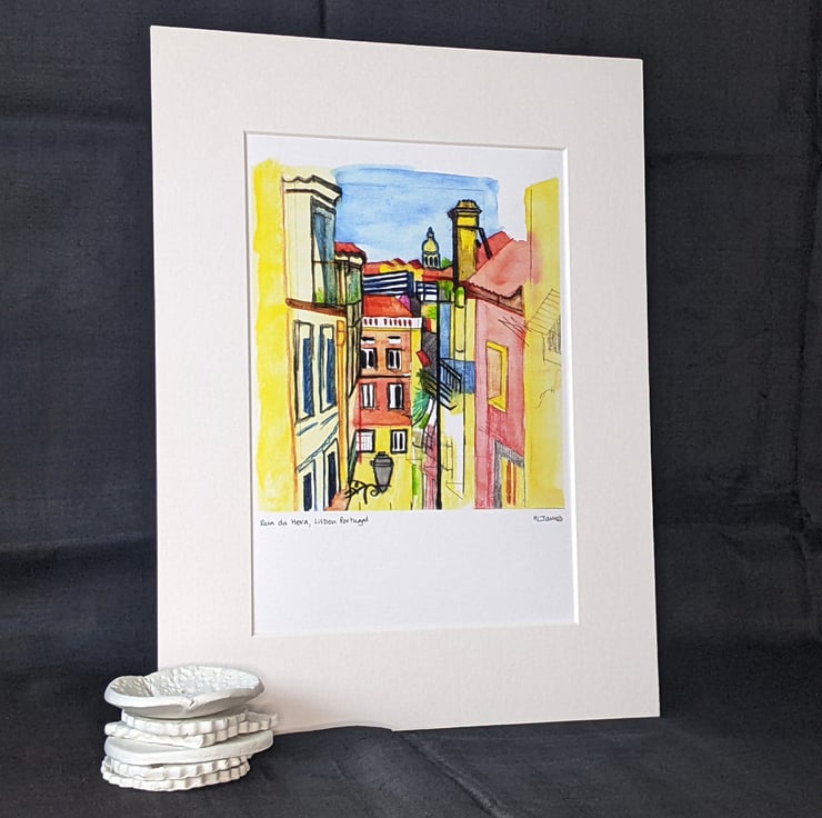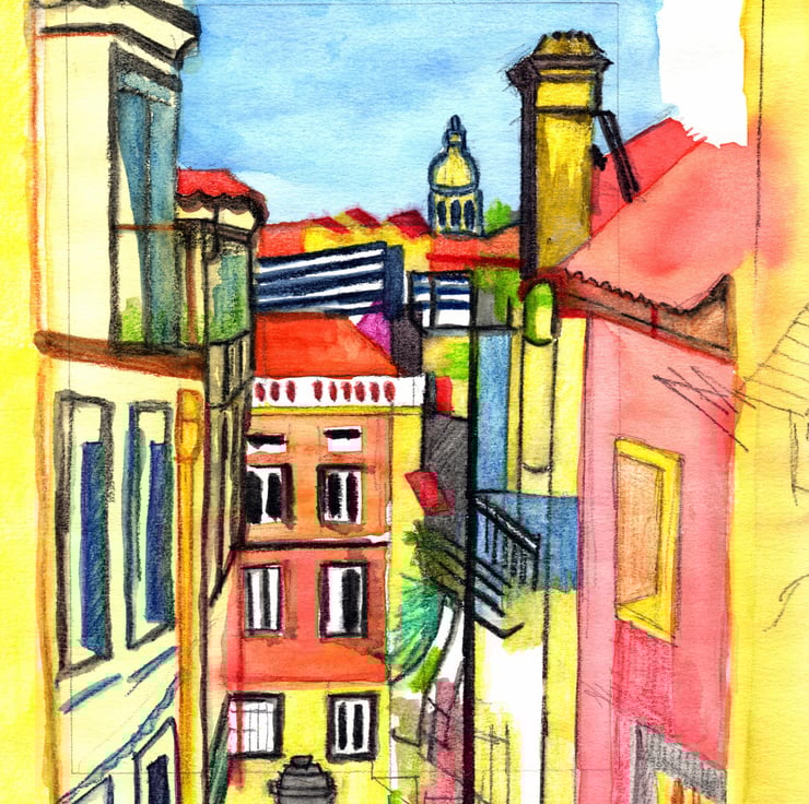 I drew this image while visiting Lisbon in Portugal in the summer of 2013 when the city was experiencing a 40 degree heat wave. This was a view of a very steep street close to our hotel and I was only able to work outside for very short periods so consequently it took several days to complete.