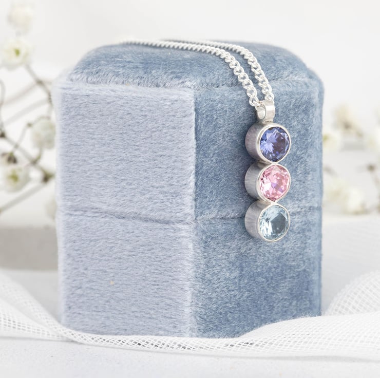 Choose your three favourite gemstones, favourite colours, or choose the birthstones to represent your loved ones in this pendant necklace. A perfect meaningful gift.