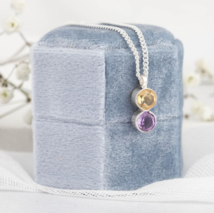 The pendant is made of 2 x 5mm round faceted birthstones, set in recycled sterling silver. The chain is 18 inches as standard, but if you'd like a different size just let m e know.