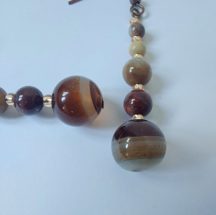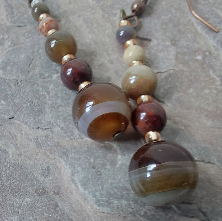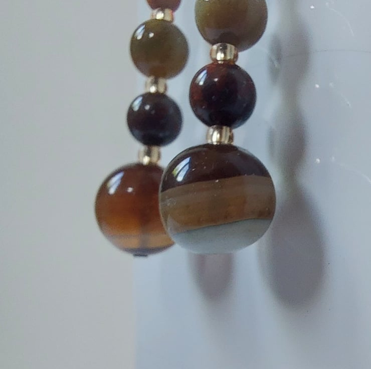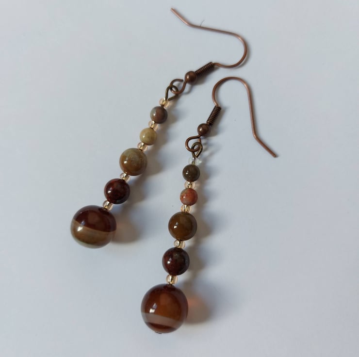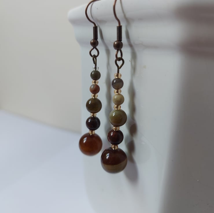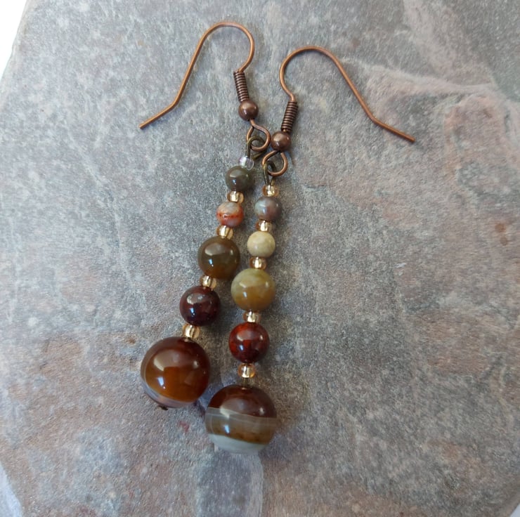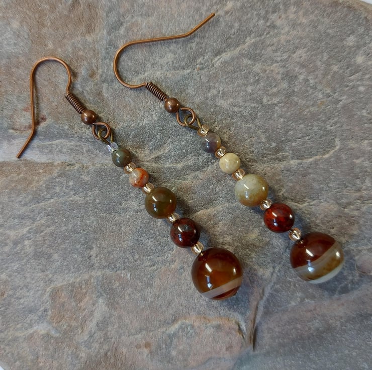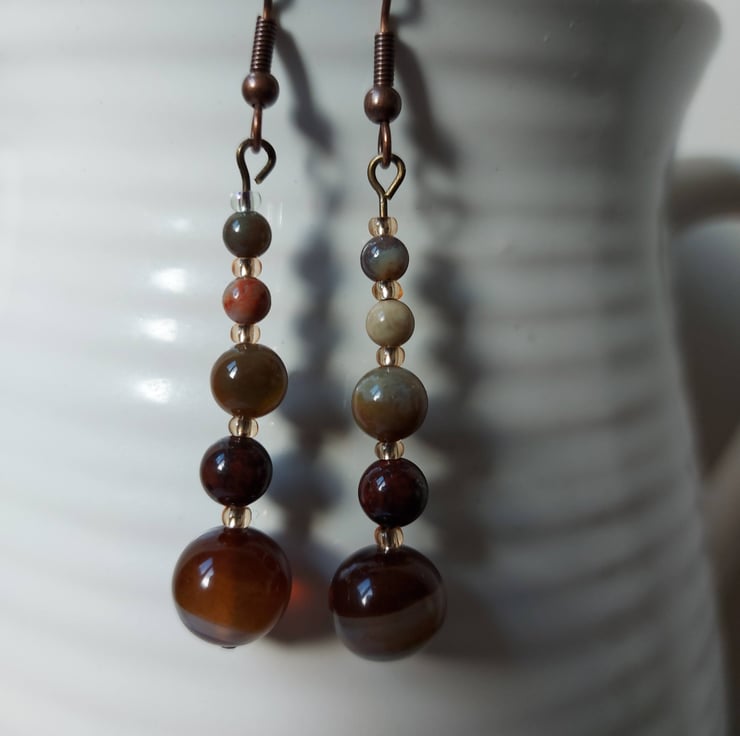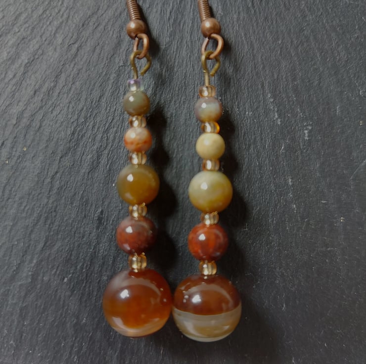 These lovely drop earrings are full of glowing autumnal colours that remind me of a walk in the woods when the leaves are falling. The five round beads on each earring are forms of semi-precious agate, ranging in size from 4mm to 10mm diameter. They are separated by Czech seed beads, clear crystal with a copper lining. The headpin and ear hooks are made of copper- coloured jeweller's wire. The drop below the hook is 4.5cm. The colours in the photos are quite variable depending on the light conditions.The ones on a light grey slate background give the most accurate representation.