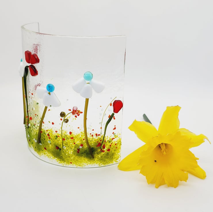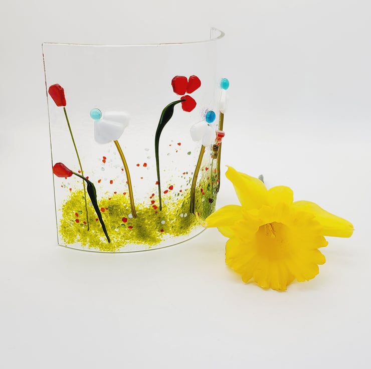 This fused glass curved panel features delicate flowers in a colourful meadow. The panel looks great in front of the window with the light shining through or with a tealight flickering behind it.