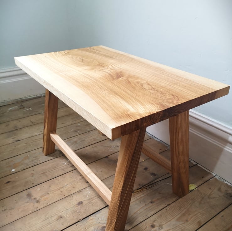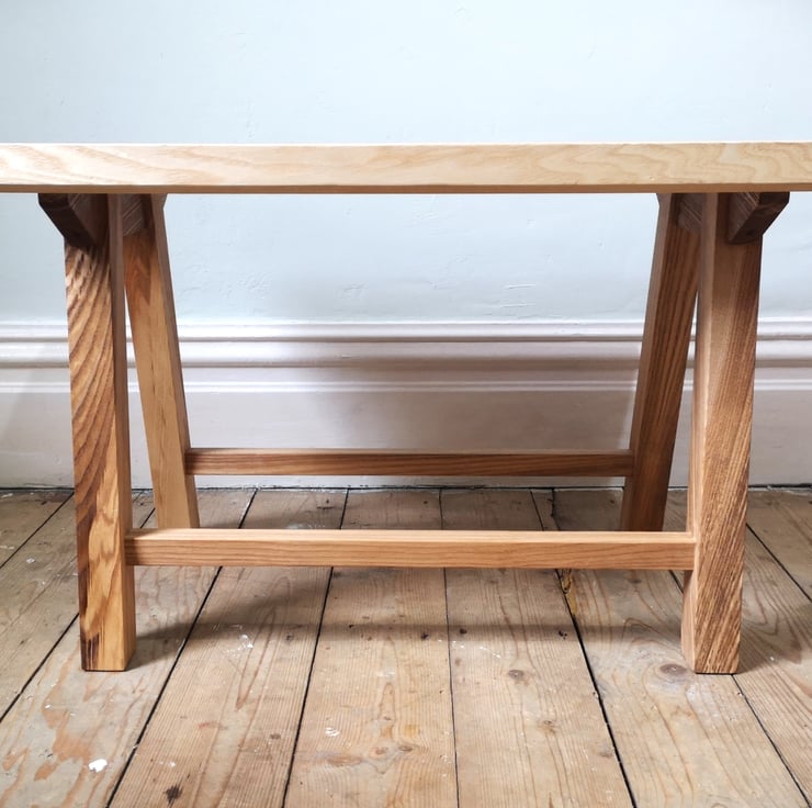 Made from a single slab of air dried ash, this dramatically grained table creates a striking silhouette. The table consists of a table top made from a full width board showcasing the intricate and beautiful contractsing light and dark grain patterns sitting on top of angled legs cut from the same slab of timber. Made using hand cut joinery throughout and finished with Danish Oil, this is a one off unique piece.
