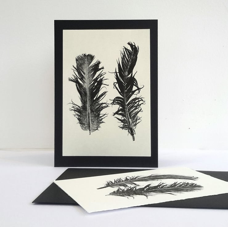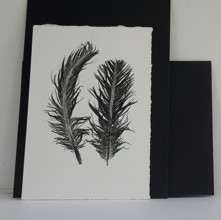 Handprinted feather prints. Mini Prints, one mounted onto a black gift card with black envelope and one to gift, keep or frame.