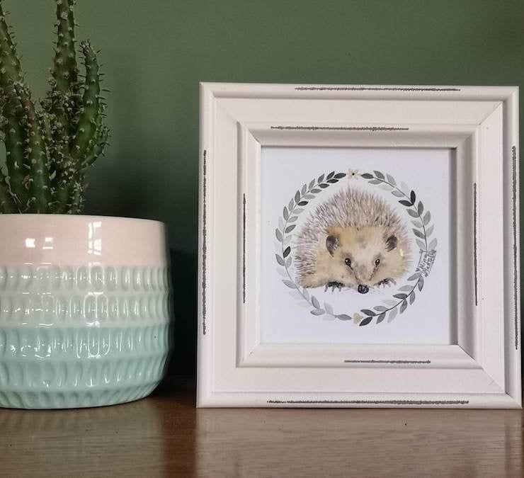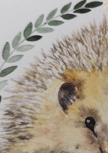 The sweetest little hedgehog painted in watercolour hues of mustard and browns. The leaves are various shades of sage. Such a pretty delicate artwork.