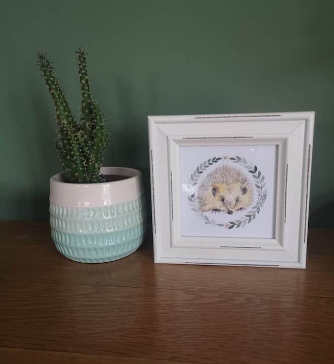 Framed in a lovely distressed effect off white wooden frame with glass. The back allows it to be wall mounted or can be sat independently. Actual watercolour measures approx 4 x 4 inches and the frame measures approx 6 x 6 inches.