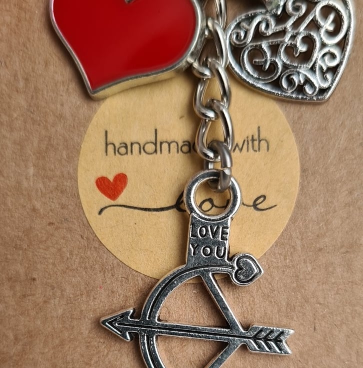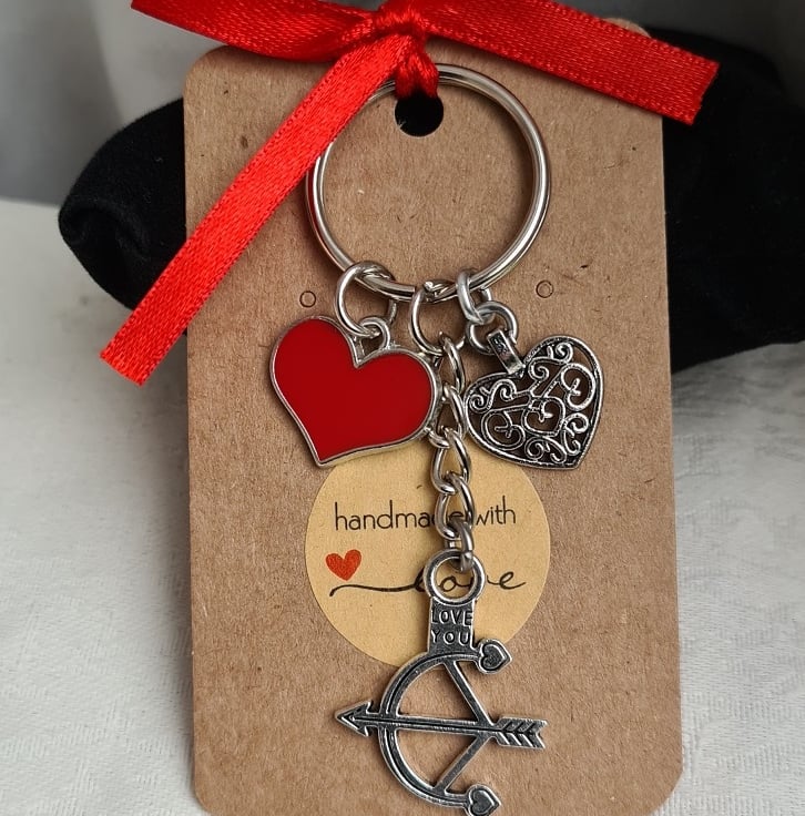 A fab key ring for the one you love. The key ring consists of a Bow and Arrow that has "Love You" on it, a filigree-type heart charm and a Red heart charm. Great as a keepsake gift.