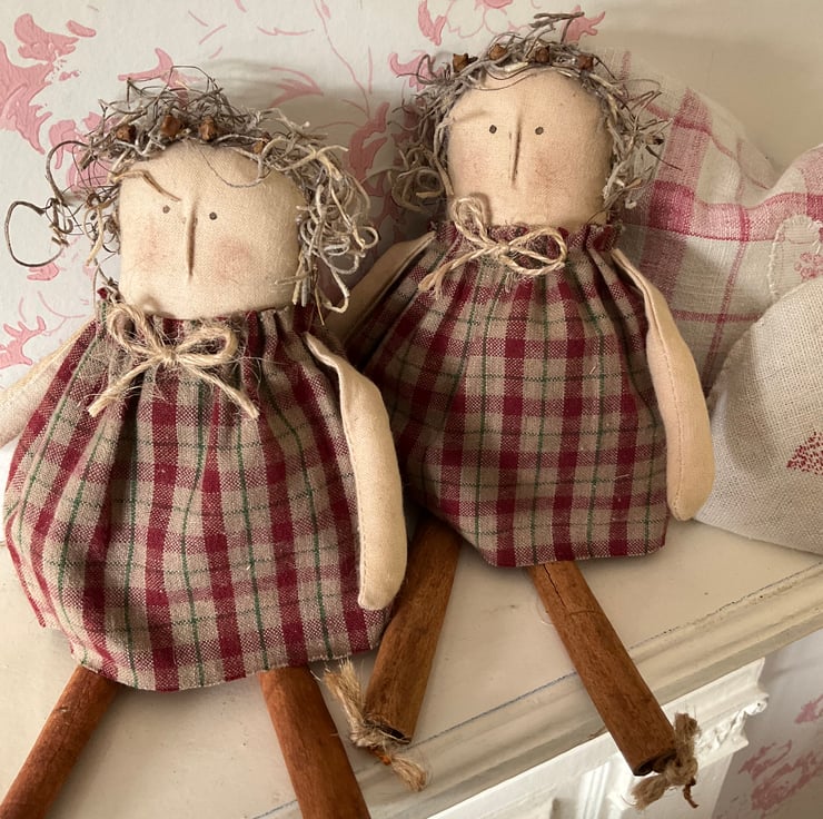 A gorgeous little primitive doll to add to your kitchen decor. Her body is slightly weighted so she’s sits comfortably on any shelf, with her cinnamon legs left dangling.
