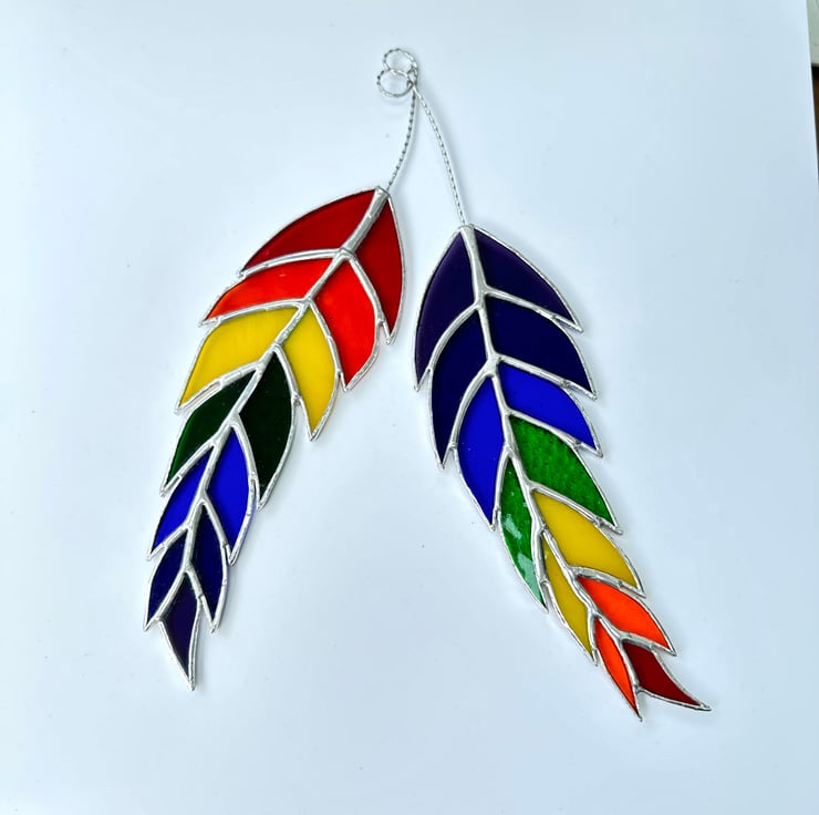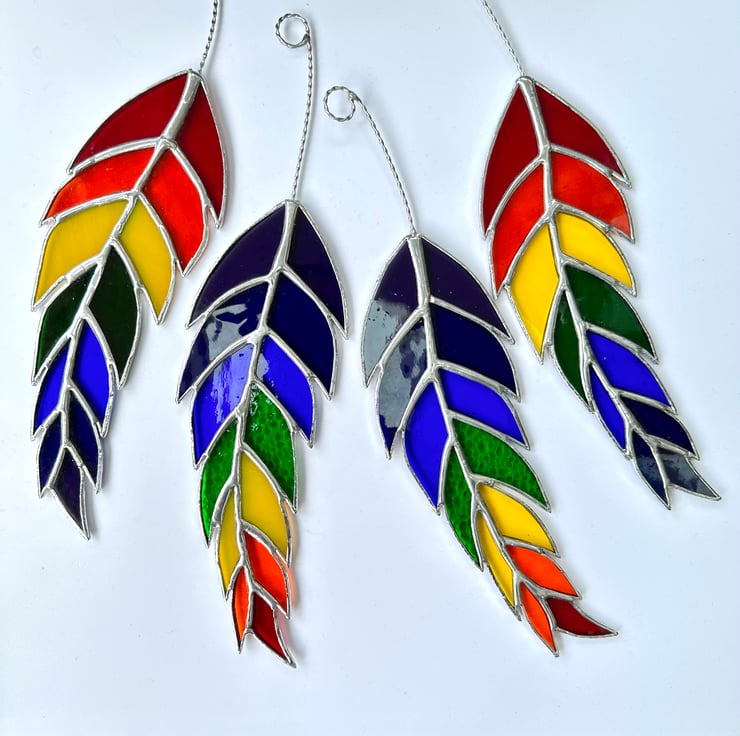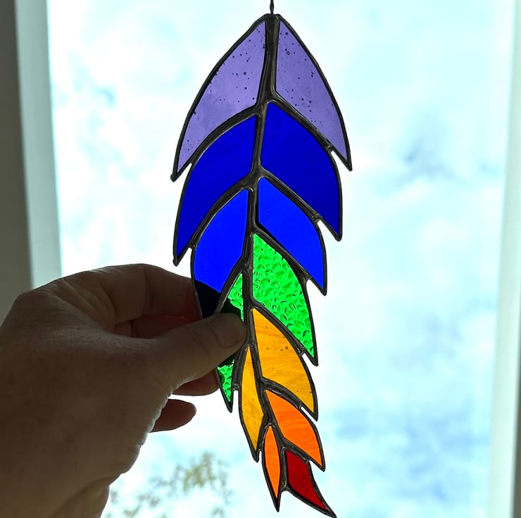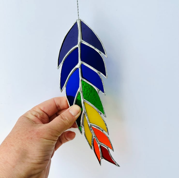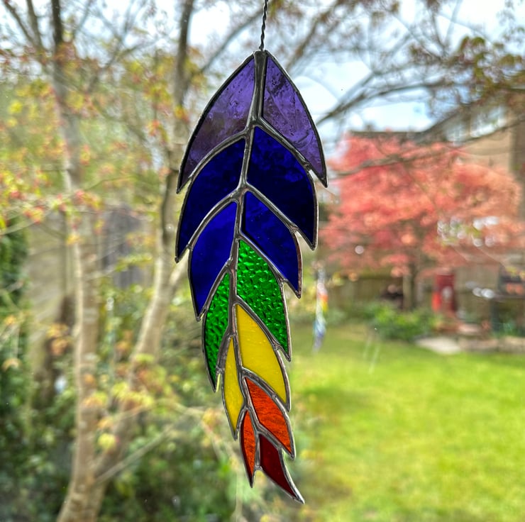 This feather has been made from all the colours of the rainbow and will look really colourful in any window. It also has lots of different textures for added interest.