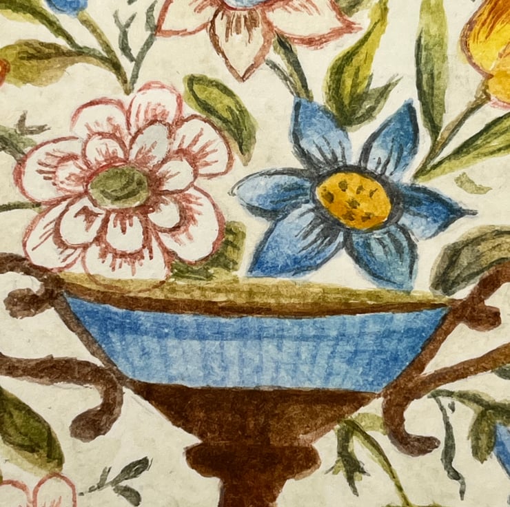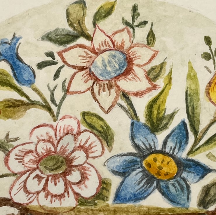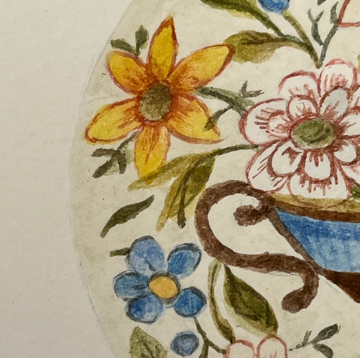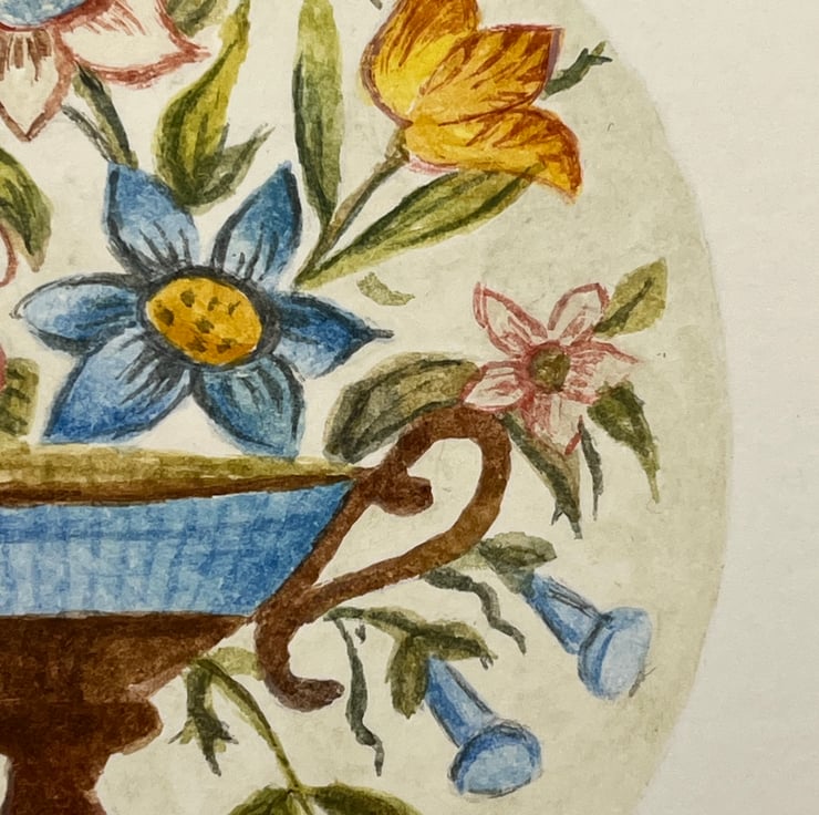 An original gouache painting of an enamel English early 19th century button on cold pressed acid free 300 gsm artists watercolour paper measuring 12cm by 12cm. A small original painting that would make an ideal gift. The painting will be sent inside a board back envelope.