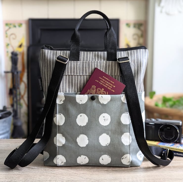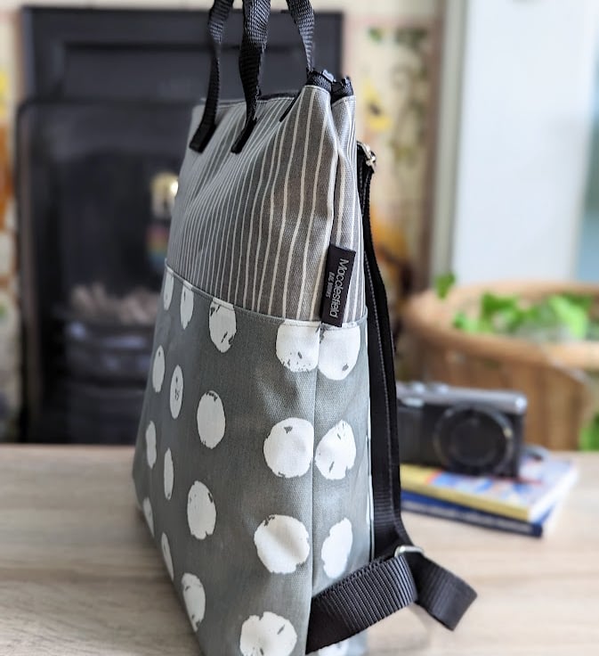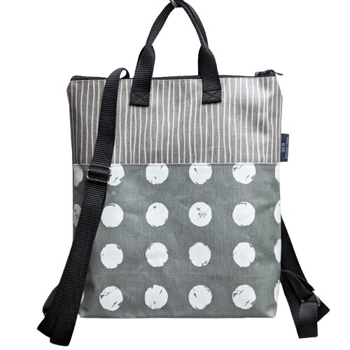 Handmade using grey spot and grey striped matt PVC coated cotton (oilcloth), the backpack has a zipped top and is lined with a black rip-stop nylon lining.