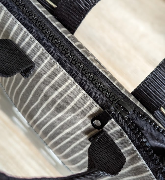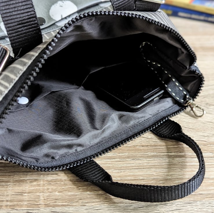 It closes by means of a chunky and sturdy plastic zip. At the back of the bag is lined patch pocket secured with a plastic snap closure. Inside, is a divided slip pocket for phone, pens etc, with a plastic snap closure. There is also a key hook on a grosgrain ribbon inside the bag, making it easy to find your keys.