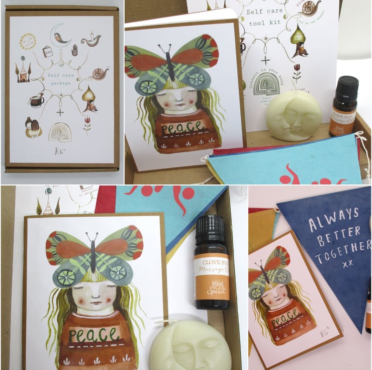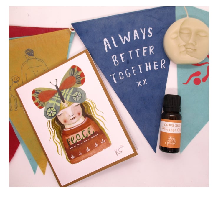 This beautiful gift set includes a limited edition poster, bunting to brighten a room, a candle and massage oil and a note book.