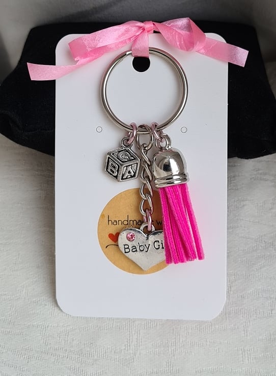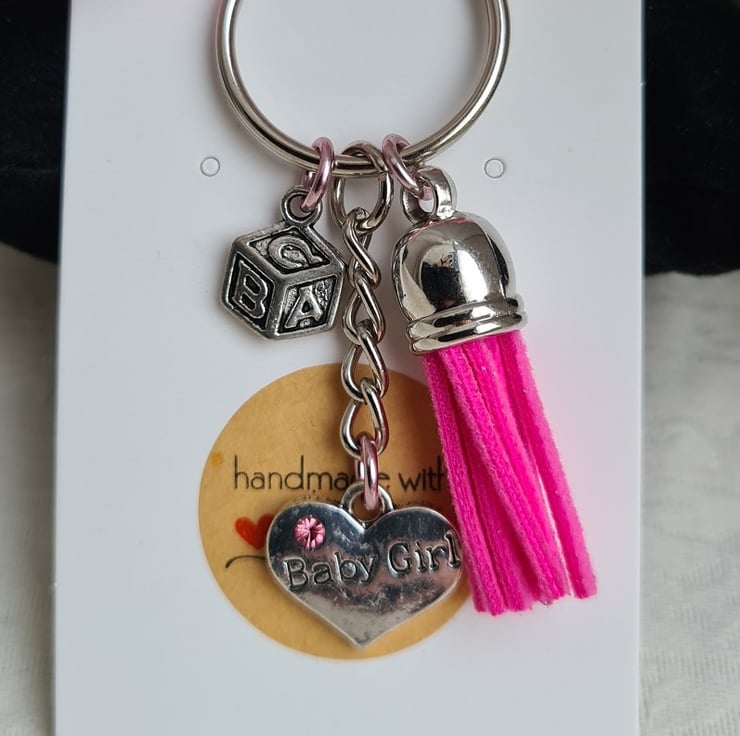 A fab key ring as a small keepsake gift for an expectant parent. The key ring consists of a Heart charm that says "Baby Girl" and has a pink gem, a Pink suede tassel, and an "ABC" block charm. A sweet way to say congratulations on your new arrival.