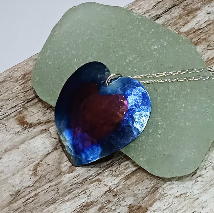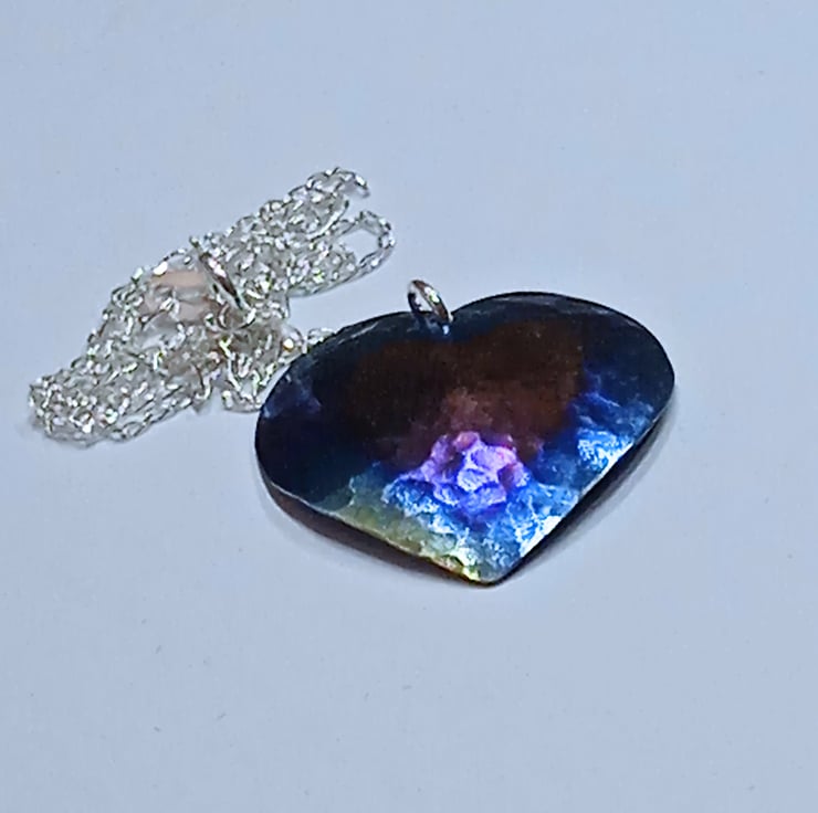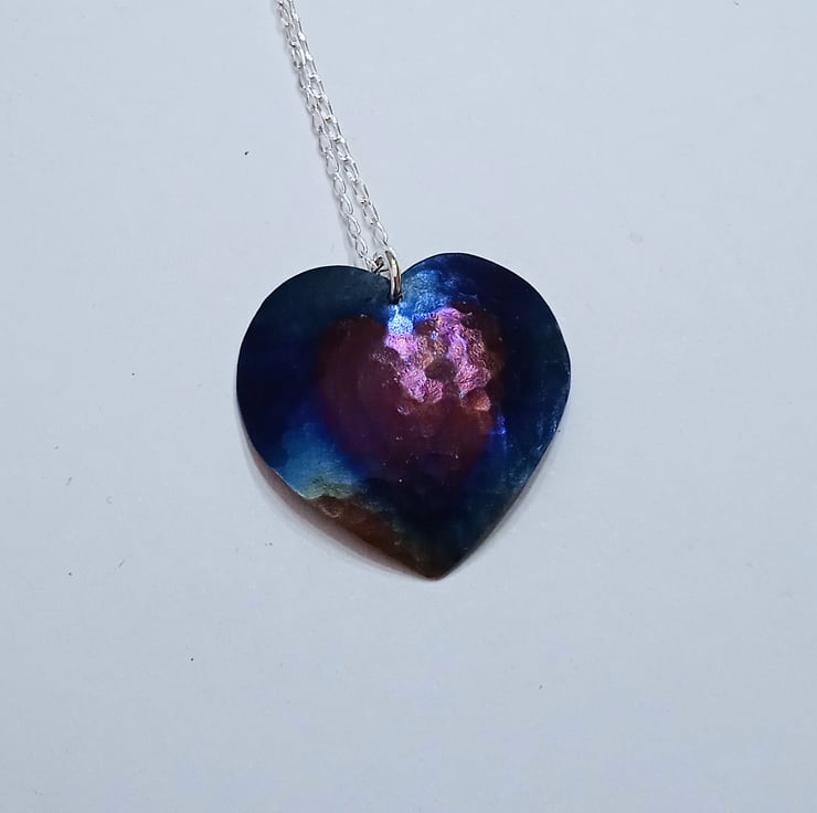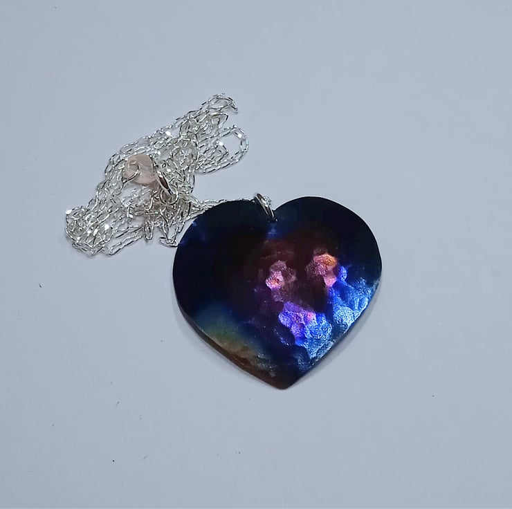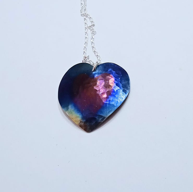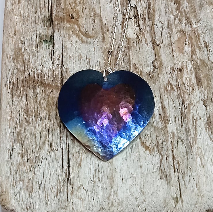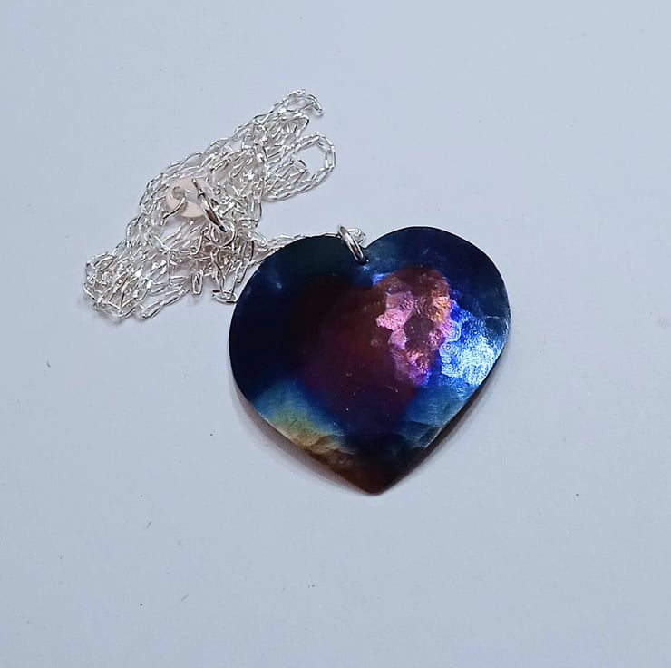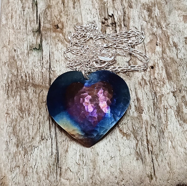 I have made this beautiful pendant by hand sawing the shape from titanium sheet. I've given the surface an attractive hammered finish to create texture and given it a polished finish before shaping and colouring. I've used a special technique in order to create an image of a heart within the colouring.
