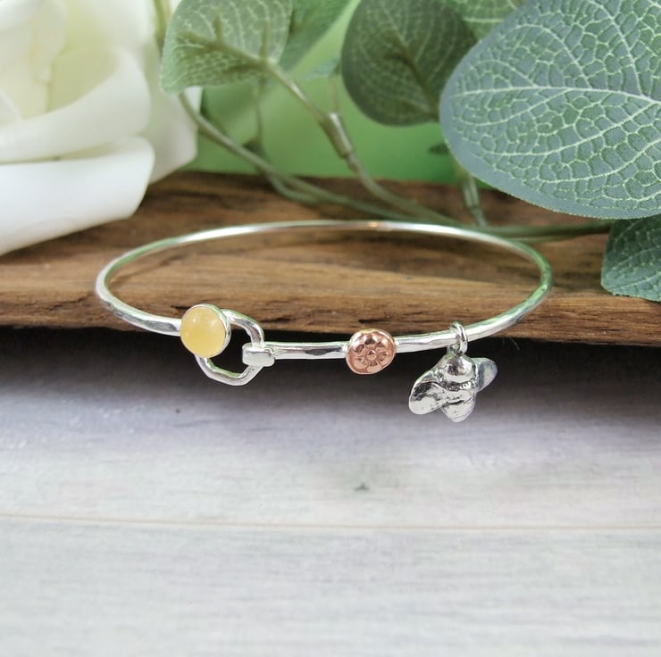 I have made the bangle from 2mm wide solid recycled sterling silver wire, at one end I have formed a hexagon shape and added a small bezel cup with a yellow aventurine and at the other a small hook to form the clasp. I have added a lttle bee charm hand sculpted from pure silver clay. At the hook end I have soldered a little hand forged copper flower leaving the little bee to travel freely between the flower and the honeycomb but secure on the bangle.