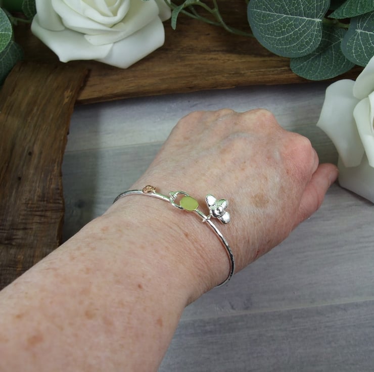 Sterling Silver Tension Bangle with Clasp. Free moving Bee Charm, Copper Flower and Yellow Aventurine Gemstone. Ladies Size Medium-(7inch wrist).