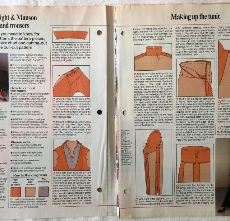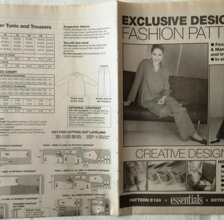 A multi-size sewing pattern for a woman's tunic and trousers in sizes 10 - 18 (bust 32.5"/83 cm - 40"/102 cm, Essentials 124, a Fenn Wright & Manson designer pattern). The loose-fitting tunic has long sleeves and a v-neck with collar. The loose-fitting trousers have an elasticated waist. The pattern sheet also includes motifs and templates for other projects.