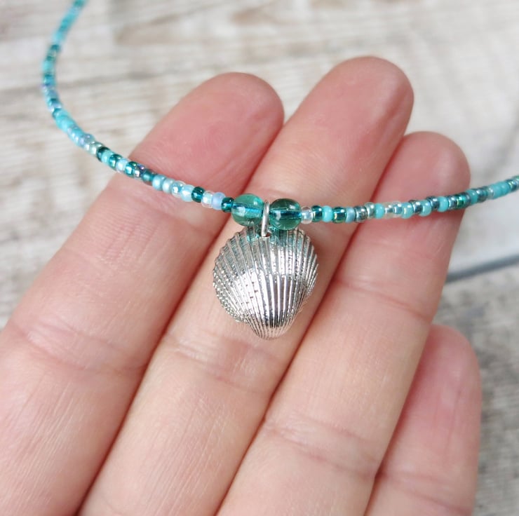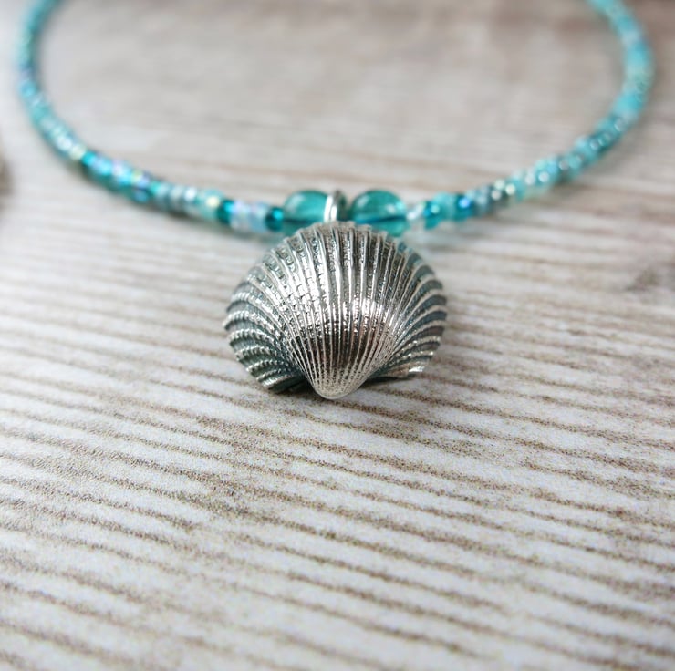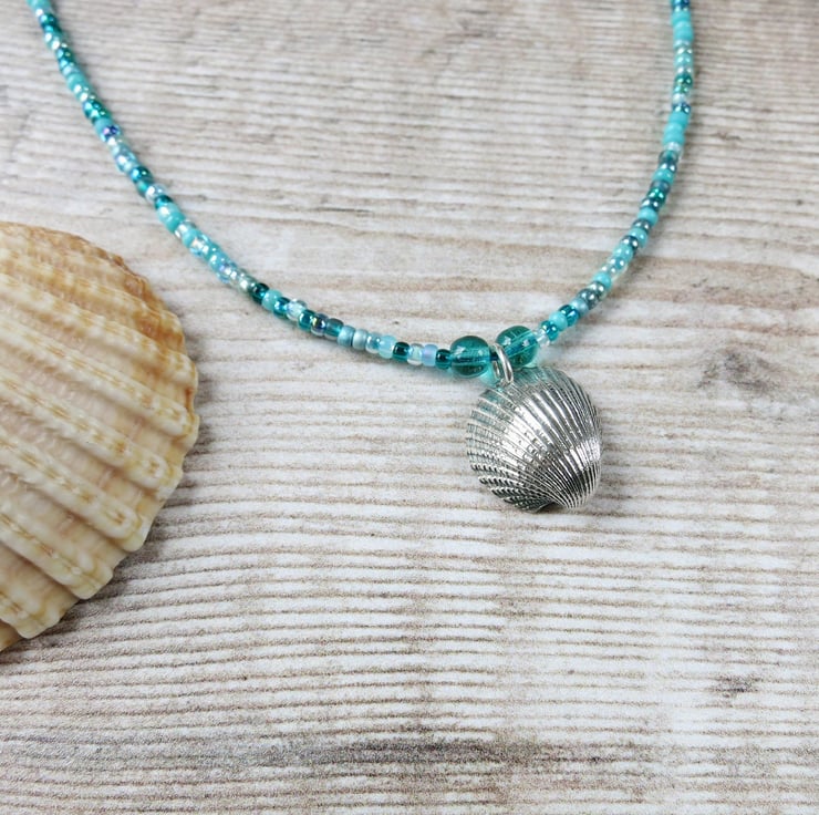 Seed Bead Necklace with a Silver Coated Cornish Cockle Shell - Turquoise Beads