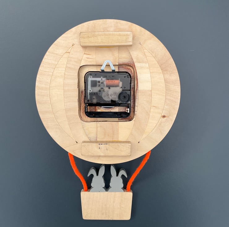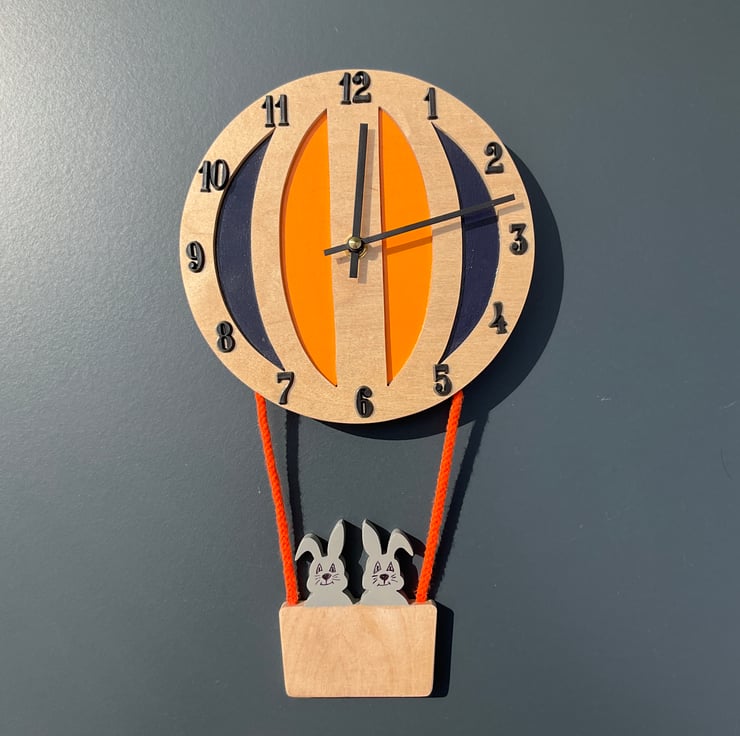 The clock is made from finest quality birch wood ply, decorated with non toxic acylic paint in dark blue and orange, its then coated coated in a non toxic varnish providing a light satin sheen.