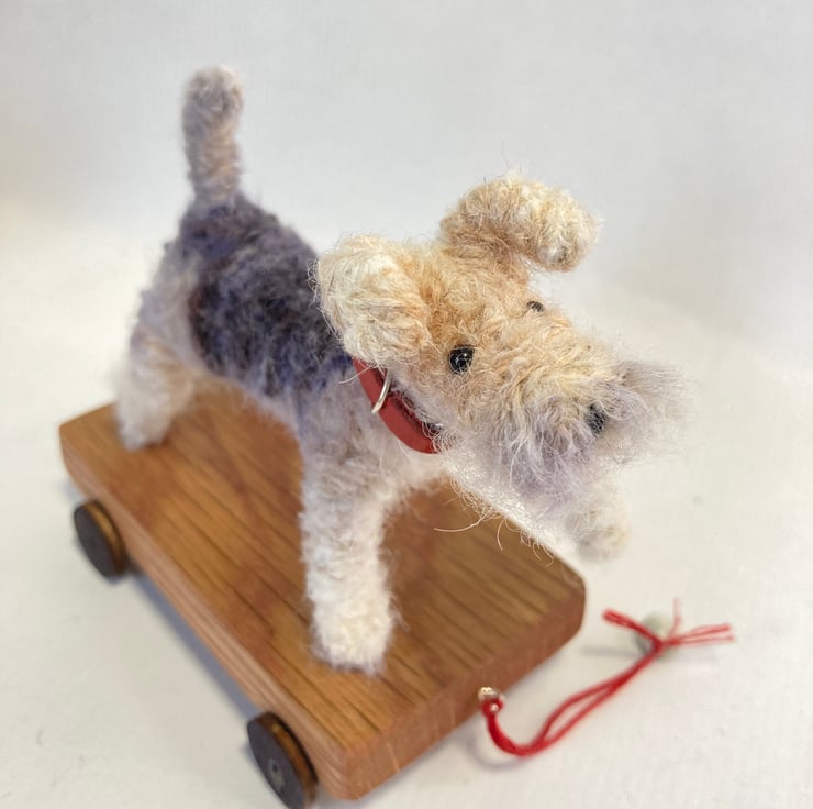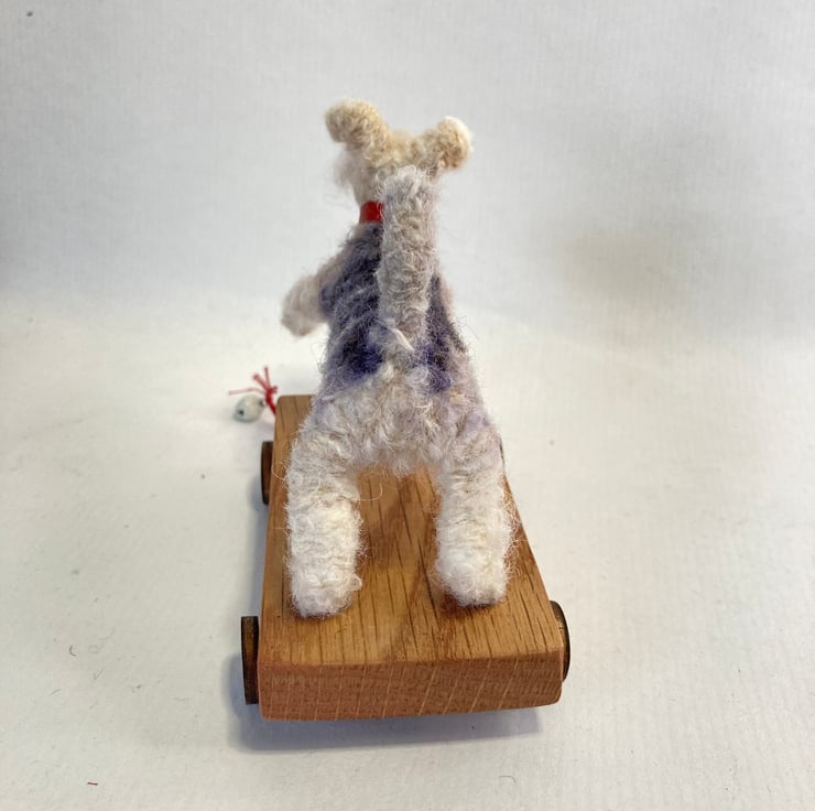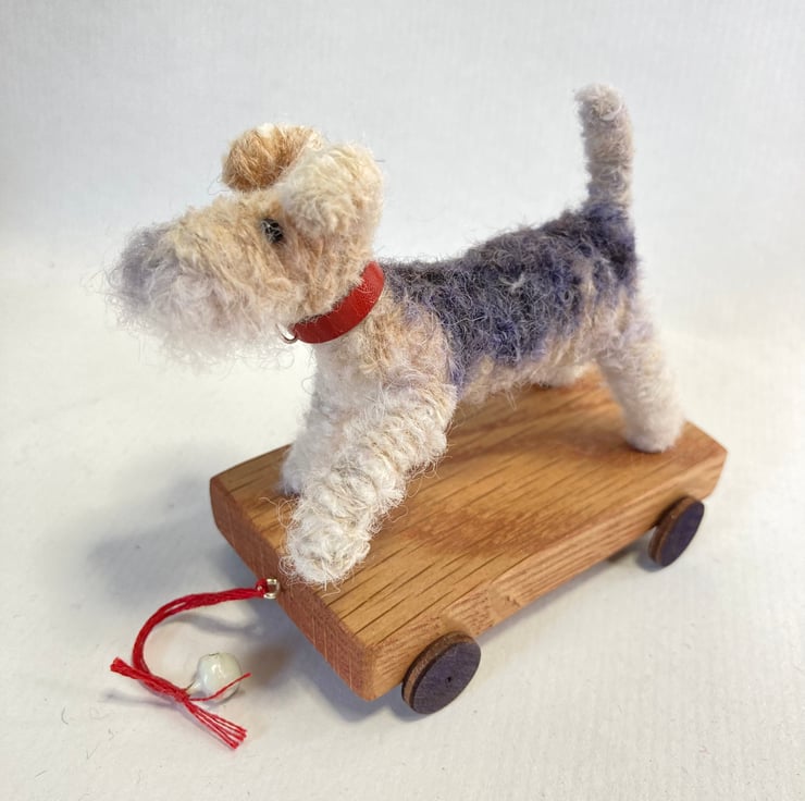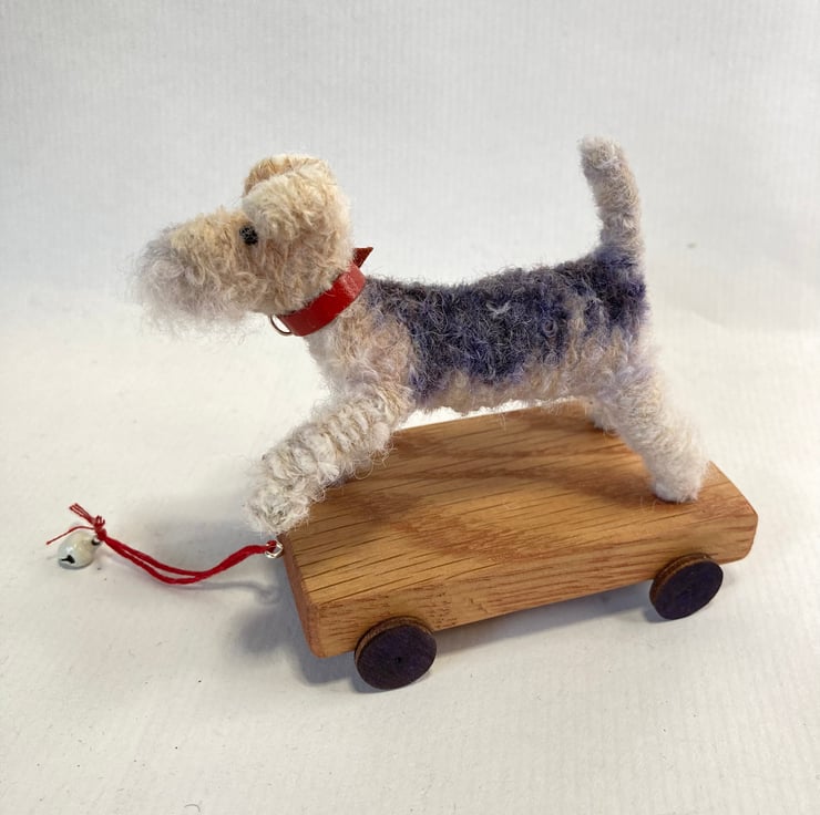 Little Digger stands 9cm tall and measures 10cm in length. He is made from wire and Alpaca Bouclé wool. He has a red leather collar and glass eyes. His trolley is made from oak and has turning wheels.