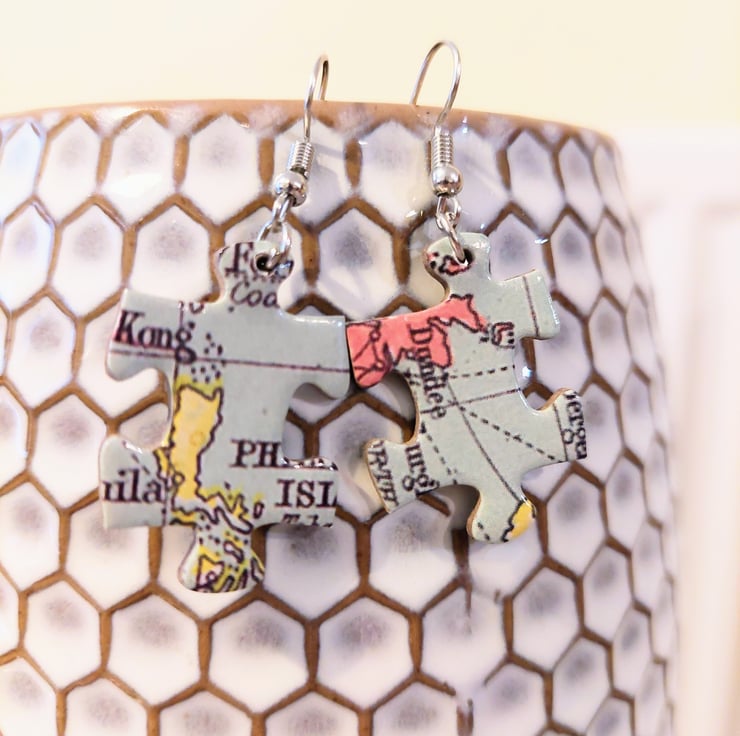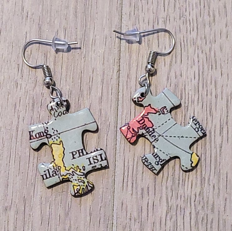 Unique pair of handmade earrings made of recycled puzzle pieces from map jigsaw puzzle