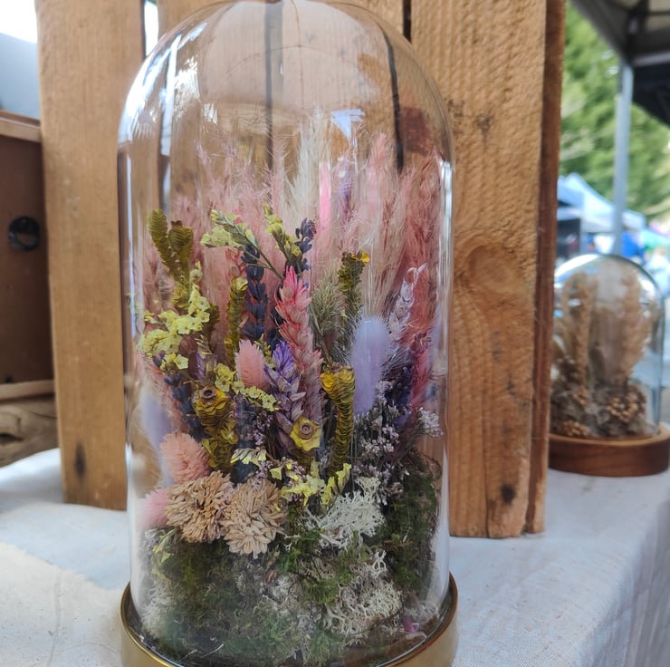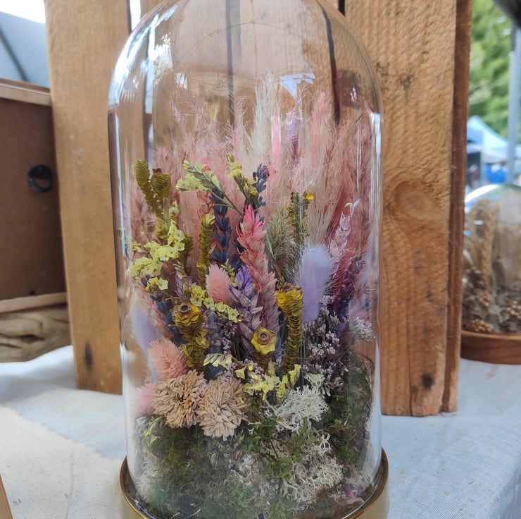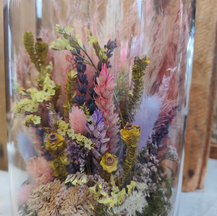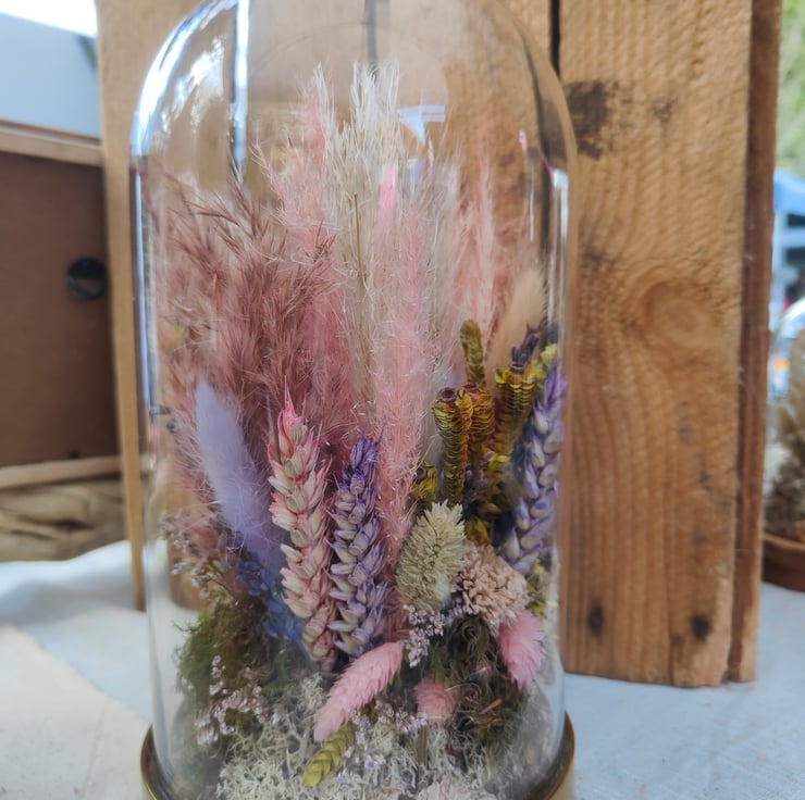 Large glass dome/cloche filled with an arrangement of dried flowers in pastel colours. The dome sits on a gold coloured metal base and is sealed in place.
