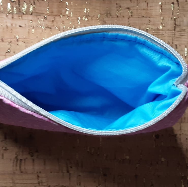 It is made from pink Polyester fabric with a small flower print on it. The lining is a plain cotton turquoise fabric.