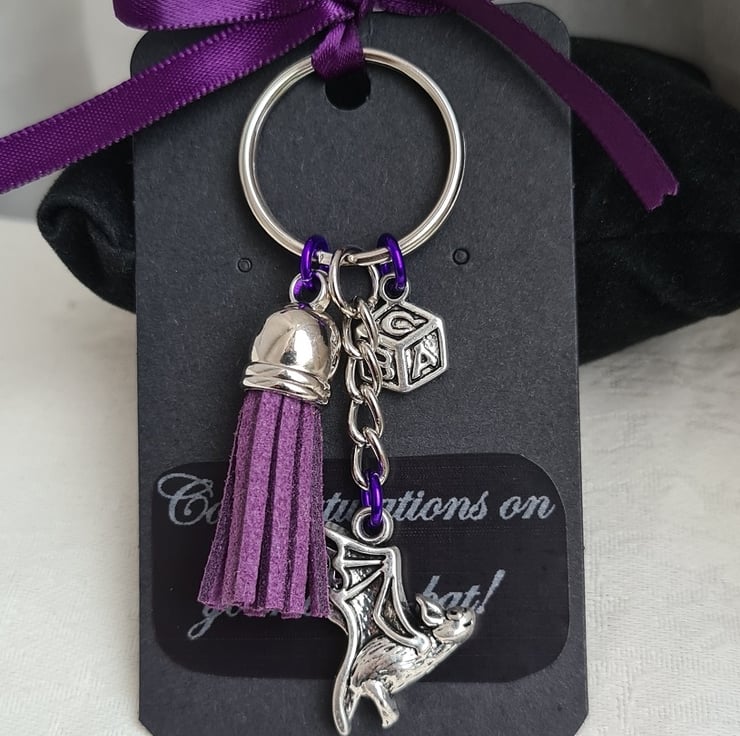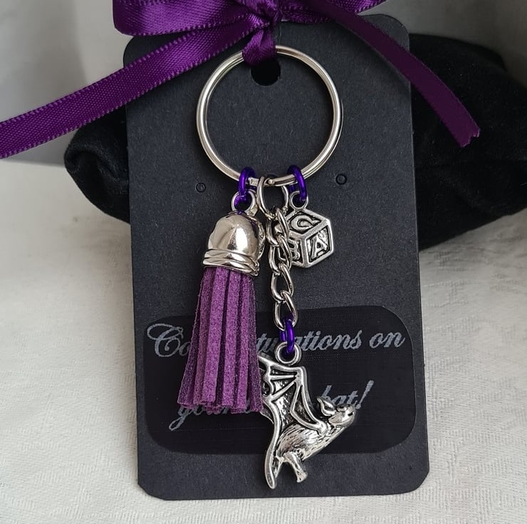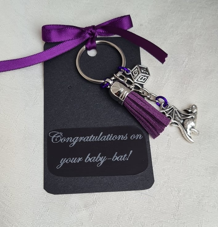 A fab key ring as a small keepsake gift for an expectant Goth/Spooky/Alternative parent. The key ring consists of a flying Bat charm, a Purple suede tassel, and an "ABC" block charm. A Spooky but Sweet way to say congratulations on your new arrival. Comes on a Black card that says "Congratulations on your Baby-Bat!".