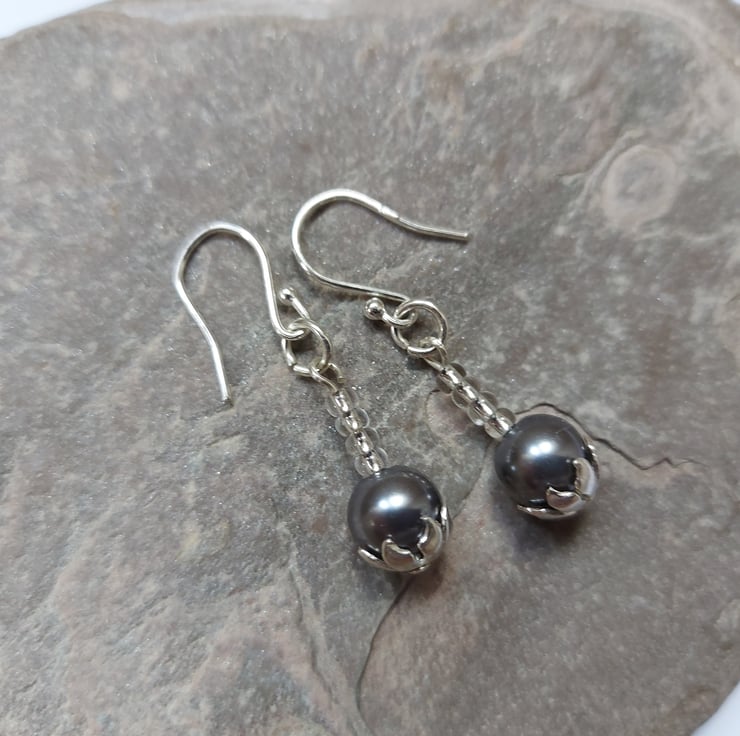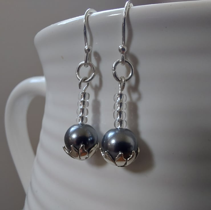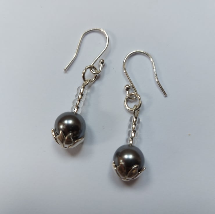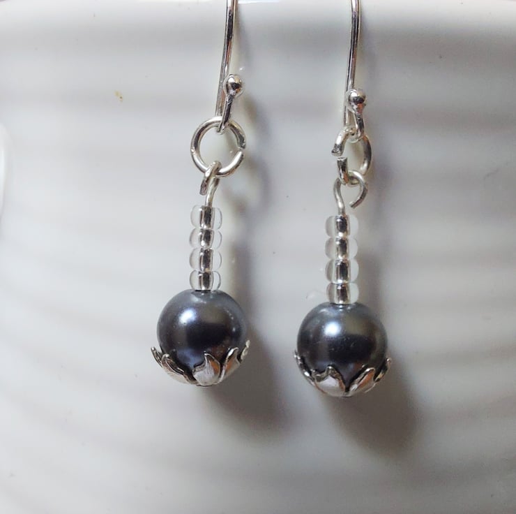 Each one features a single dark grey freshwater pearl, diameter 8mm, nestled in a sterling silver bead cup in the form of flower petals. Above the pearl I have inserted four Czech crystal beads, sparkling clear with a silver lining. The beads are mounted on a sterling silver headpin, connected to an elegant ear hook of the same material. The drop below the hook is 2.5cm.