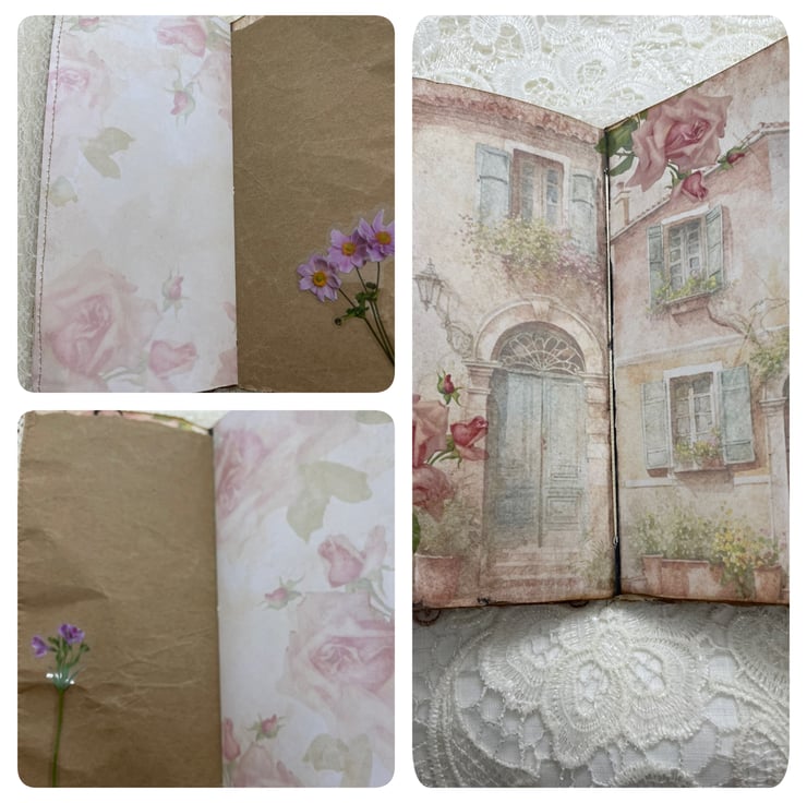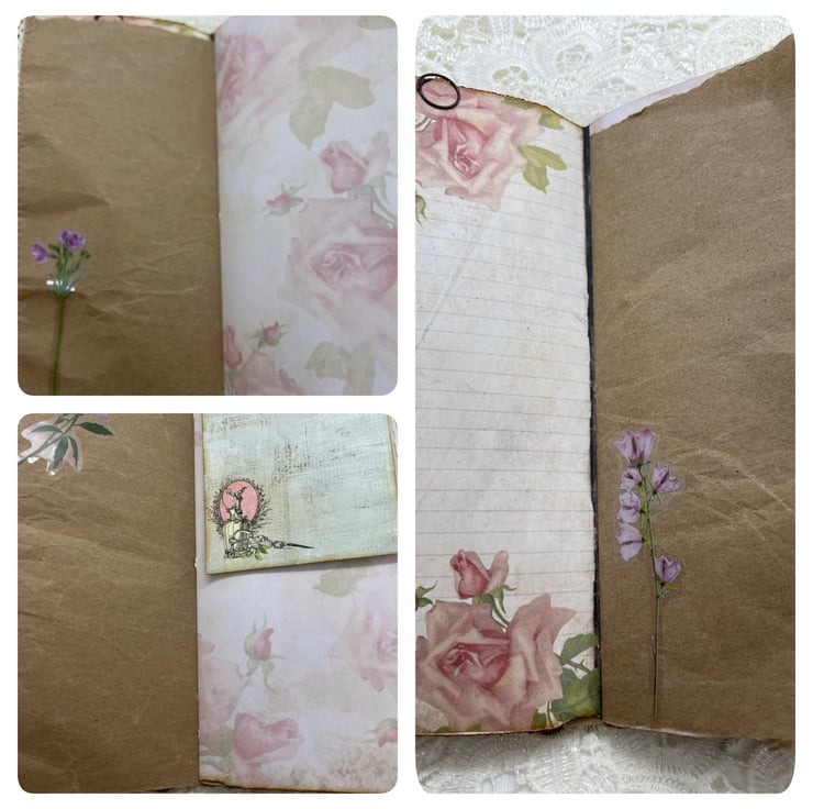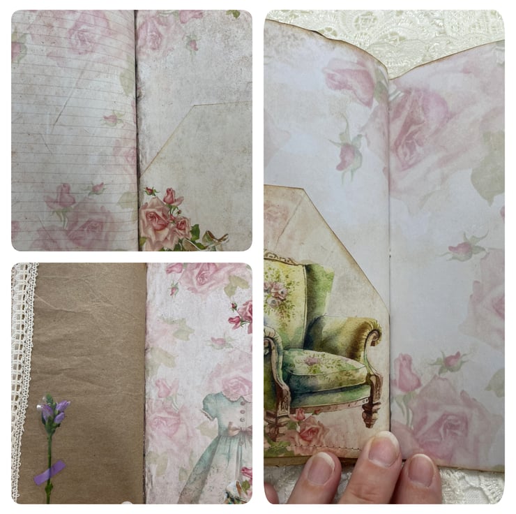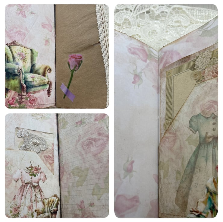 Wrapped in a glassine bag with a rose topper, pinned closed with a vintage style hat pin, a beautiful journal called Amelia after my Grandmother. An item that could have been hidden in a vintage suitcase, holding her dreams and wishes for her future. Hidden and forgotten, found by a future generation to read and treasure her memories. Made up of printed papers and brown wrapping paper pages. Some have pockets with ephemera for your own memories. Every page is edged with lace.